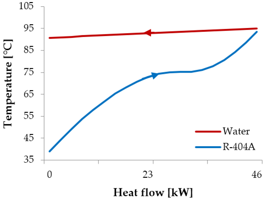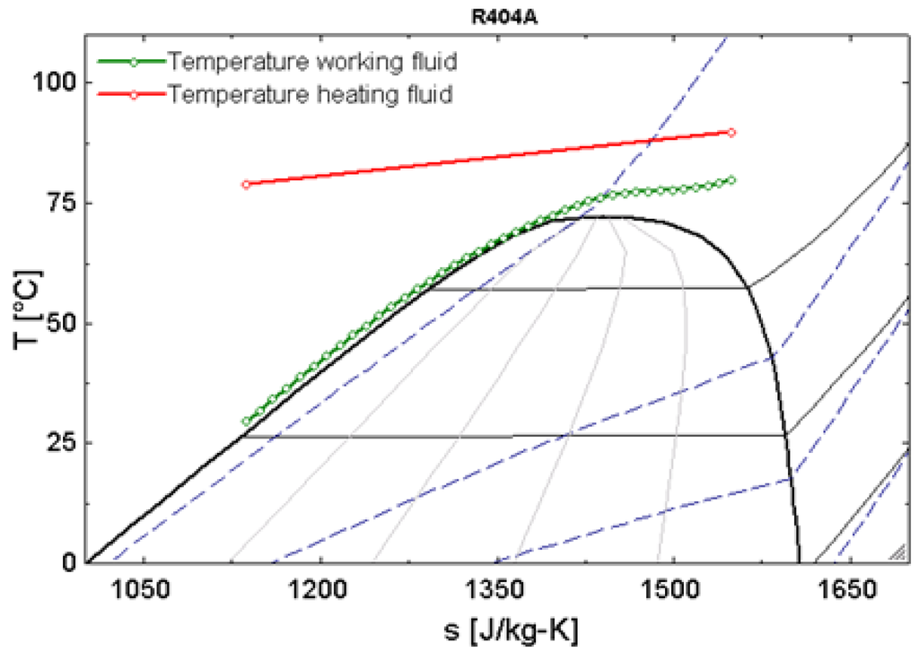 A representative supercritical heating process is depicted in Figure 1, showing the temperatures of the heat transfer fluid and an organic fluid R-404A, with a pinch point temperature difference of 10 K, which exists at the exit of the heat exchanger (the organic fluid’s outlet).
