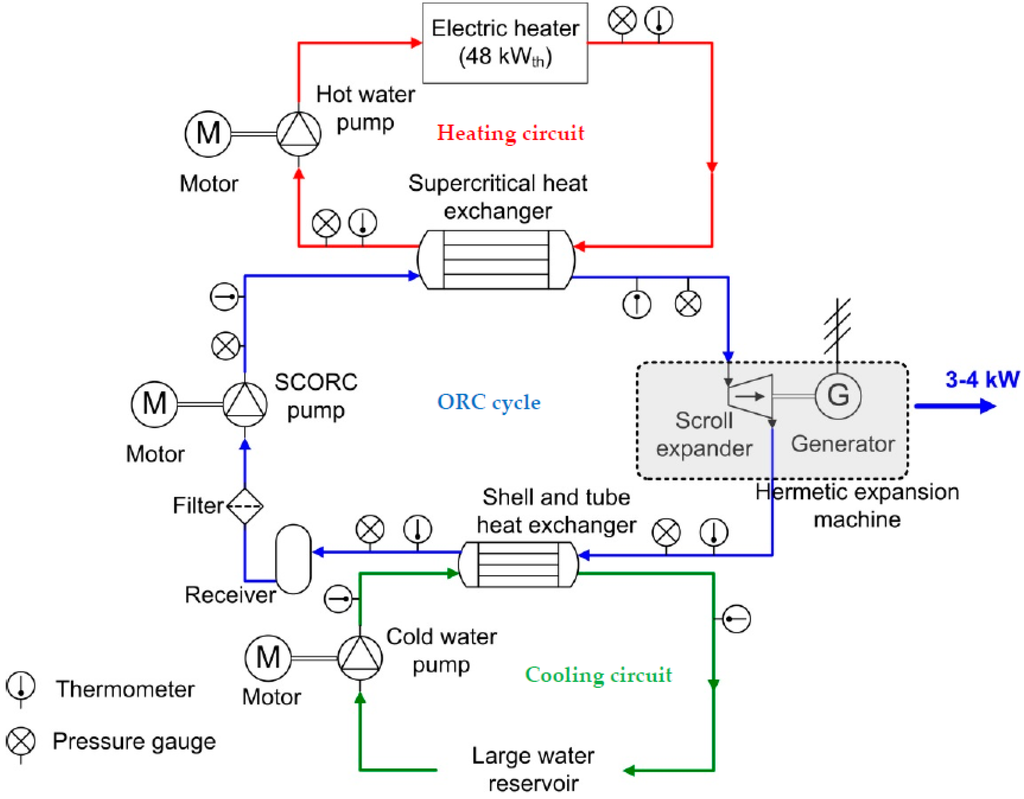 A solar PV collector is a combination of a photovoltaic panel and a solar thermal collector that simultaneously generates heat and electricity. The low grade excess heat from the CPV/T circuit is utilized in the supercritical heat exchanger located in the ORC engine. However, it should be emphasized that the first tests were done in the laboratory where instead of a solar collector an electrical heater with a capacity of 48 kWth was used. Each component was tested in this installation under controlled conditions. However, the main focus in the project was on evaluating the performance of the heat exchanger and the expander (inverted scroll compressor). On the component level the ORC (blue line) consists of a pump, a heat exchanger (evaporator, vapour generator), an expander/turbine (inverted compressor) and a condenser. There is no big variation of the components of the ORC engine installed in the laboratory and the field installation. Concerning the cooling (green line), in the laboratory conditions a cooling water circuit represented by a large reservoir with a conventional shell-and-tube heat exchanger was used, while in the field installation an evaporative condenser was utilized in order to maintain the condensing pressure of the organic fluid as low as possible, due to the pump’s inlet limitation of 17 bar. Figure 2 illustrates the layout of the experimental test set-up installed in the laboratory.
