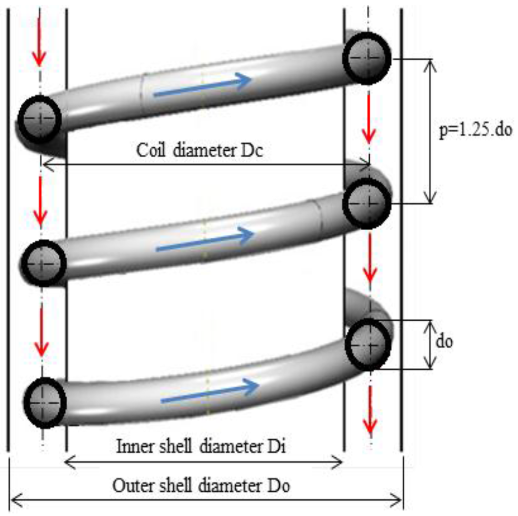The minimum clearances between the shell walls (annulus) and the coil and between two consecutive turns of the coil can be varied. The pitch, which is the spacing between consecutive coil turns (measured from the center to center) is set here at p = 1.25 × d0, which is a common design value in such heat exchangers. Figure 3 presents the configuration of the helical coil heat exchanger.