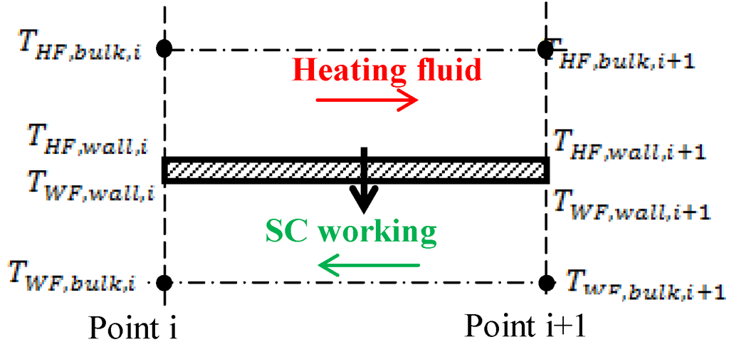 where Qi is the heat transferred in one control volume, m is the mass flow rate, T is the temperature of the fluid, U is the overall heat transfer coefficient, Cp is the specific heat capacity, A is a surface area, d is a tube diameter, λ is a thermal conductivity of the tube and h is the enthalpy. Among the subscripts WF is working fluid, HF is heating fluid, out is outer conditions/area, in is inner conditions/area, bulk is at bulk conditions, wall is at wall conditions and i is the iteration step.