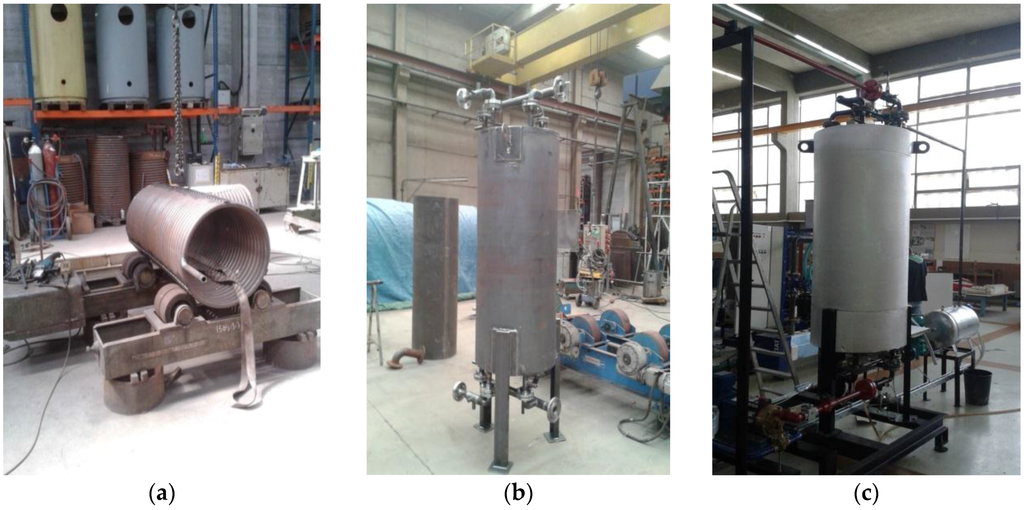 Construction of the helical coil heat exchanger: (a) helical coil; (b) manufactured heat exchanger; and (c) heat exchanger installed in the ORC installation.