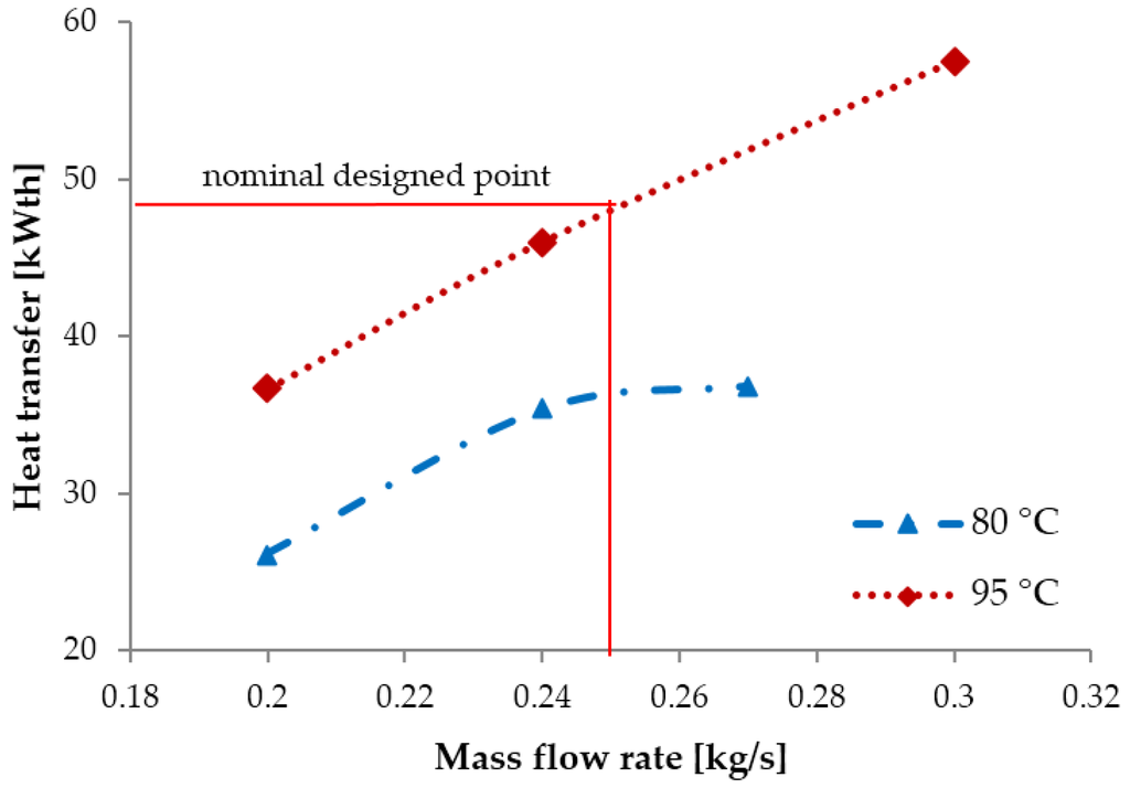 4.1. Performance Evaluation of the Heat Exchanger at Variable Mass Flow Rate of the Organic Fluid and at Heat Source Inlet Temperatures of 80 °C and 95 °C