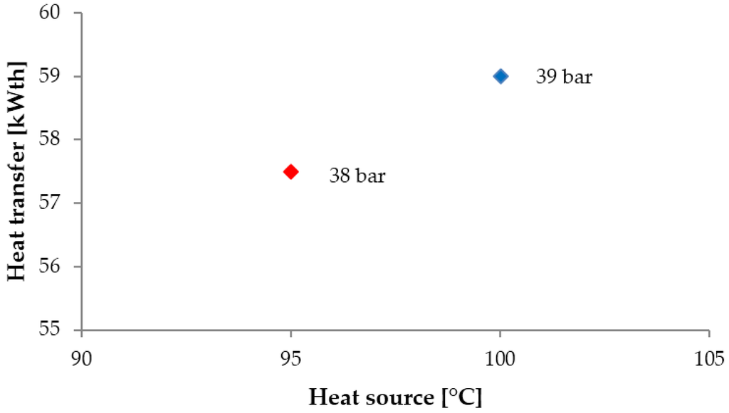 Figure 7 presents the heat transfer rate in the heat exchanger as a function of two different inlet temperatures at the hot side such as 95 °C and 100 °C. It can be noticed from this figure that at 95 °C the maximum heat transferred at the coil side is 57.5 kWth. The operating pressure under these conditions is 38 bar and is near to the critical pressure of the organic fluid. Further, at the inlet temperature of 100 °C the operational pressure is 39 bar. A maximum heat transfer of 59 kWth is achieved at the coil side of the heat exchanger at these operating conditions.