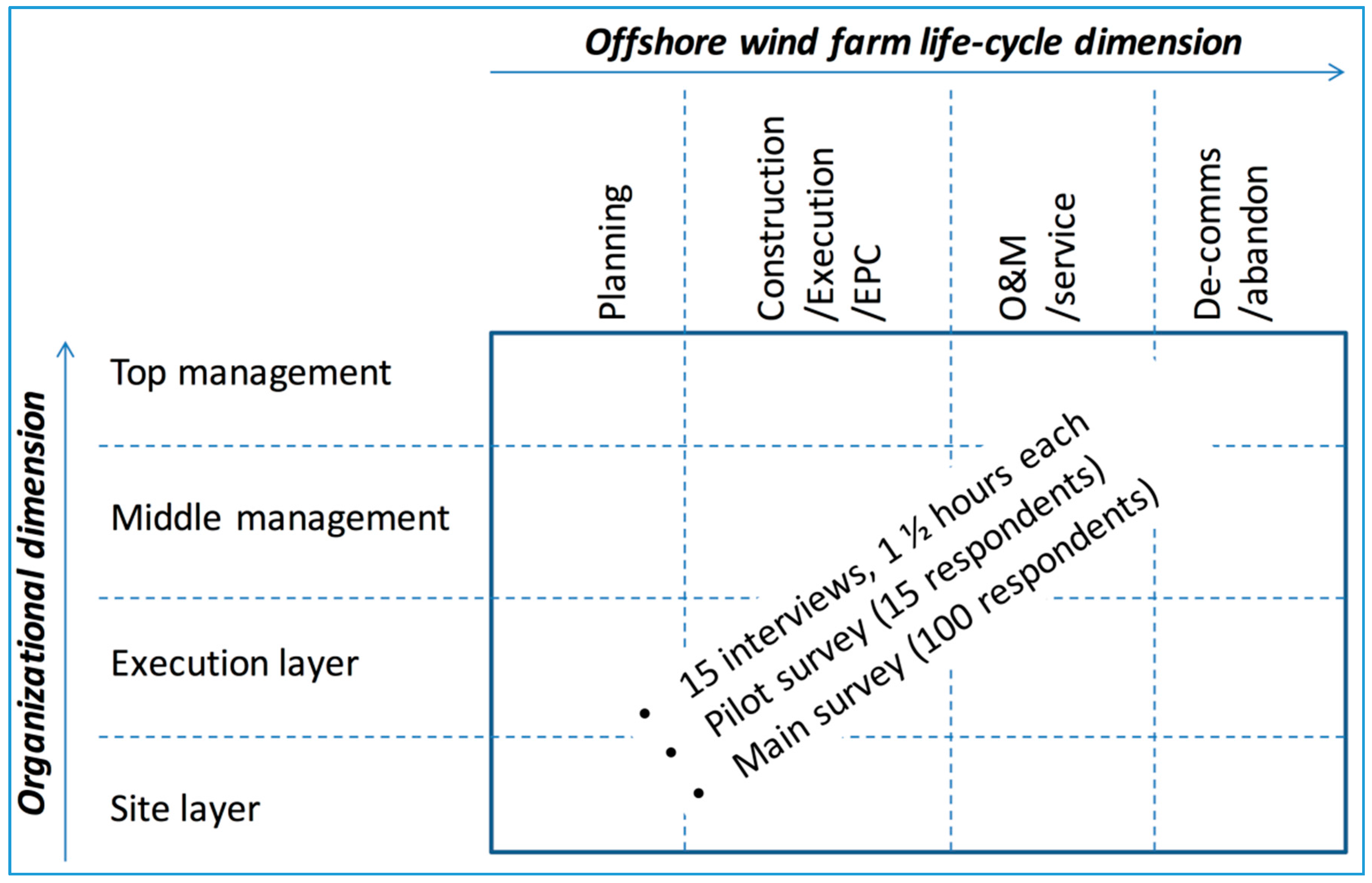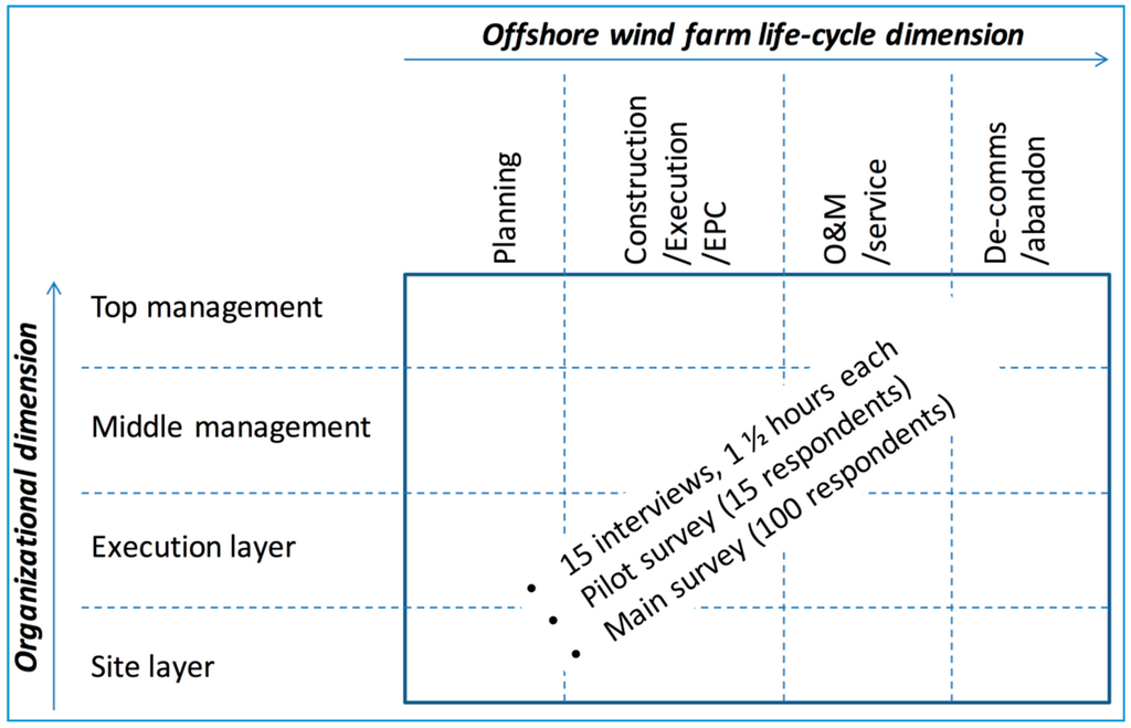 To explore the topic, a largely WP-driven selection process yielded a total of 15 company interviews comprising a total of 18 company interviewees. The interviewees were chosen in order to represent the entire WP business unit in the interview process. An extensive interview protocol was simultaneously designed by the research team in order to be able to cater to all of the different organizational constituencies selected for interview within WP. The interviewees were chosen along several different dimensions, as illustrated in Table 1: they had to represent different organizational layers of management within the company; they had to represent the different offshore wind farm life-cycle phases; and lastly, the interviewees had to have representative expertise within the key parts making up an offshore wind farm (for example, the WTG, the foundations, the underwater cables and the substations). It was also important that the interviewees had some knowledge of both logistics and R&D within the company or at least within the industry in general (see Figure 1).