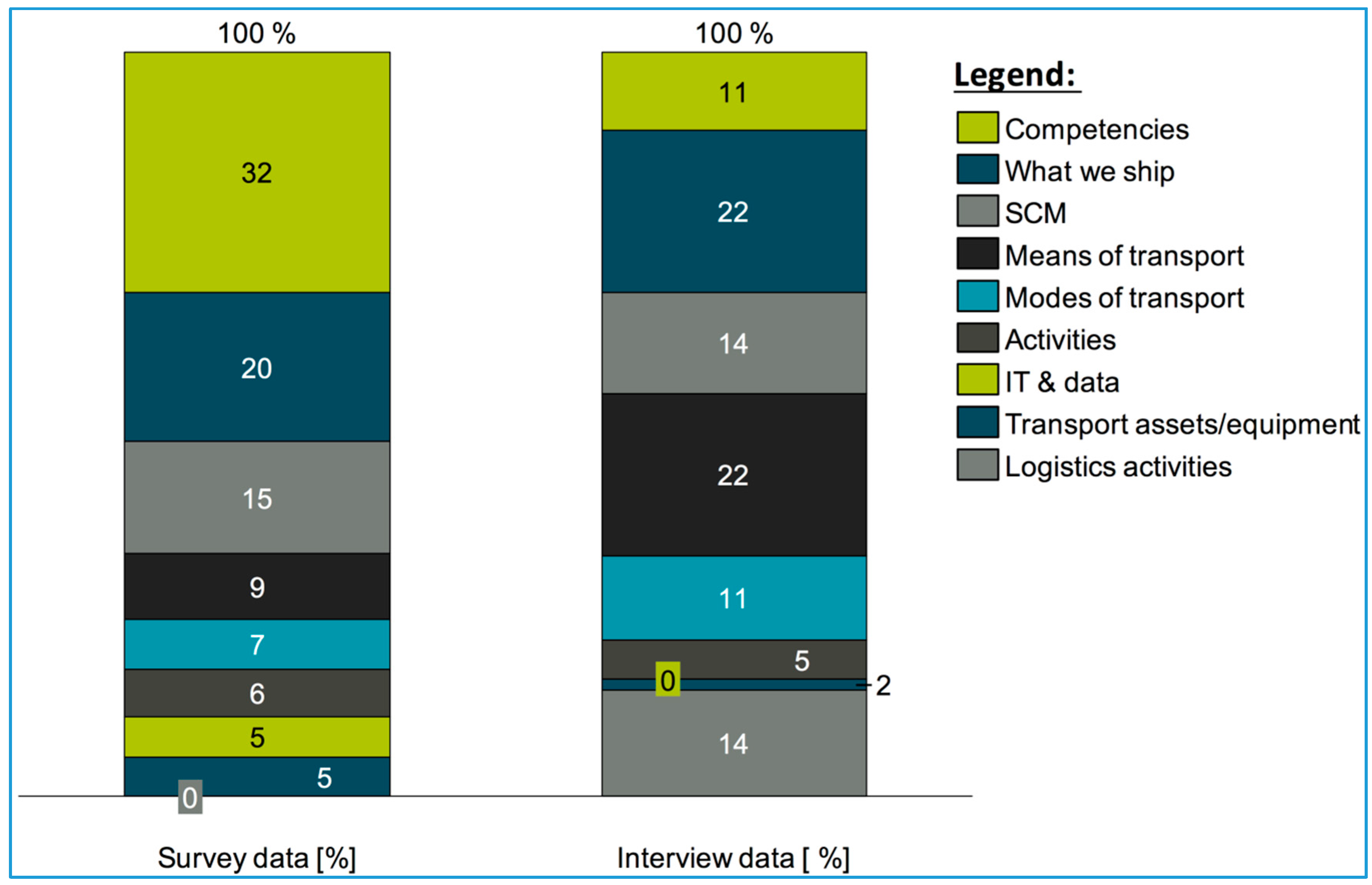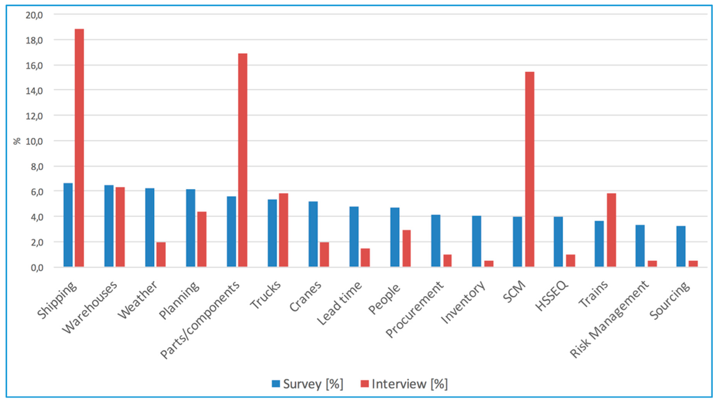 Logistics words frequency (in %) categorized along dimensions from surveys vs. interviews.