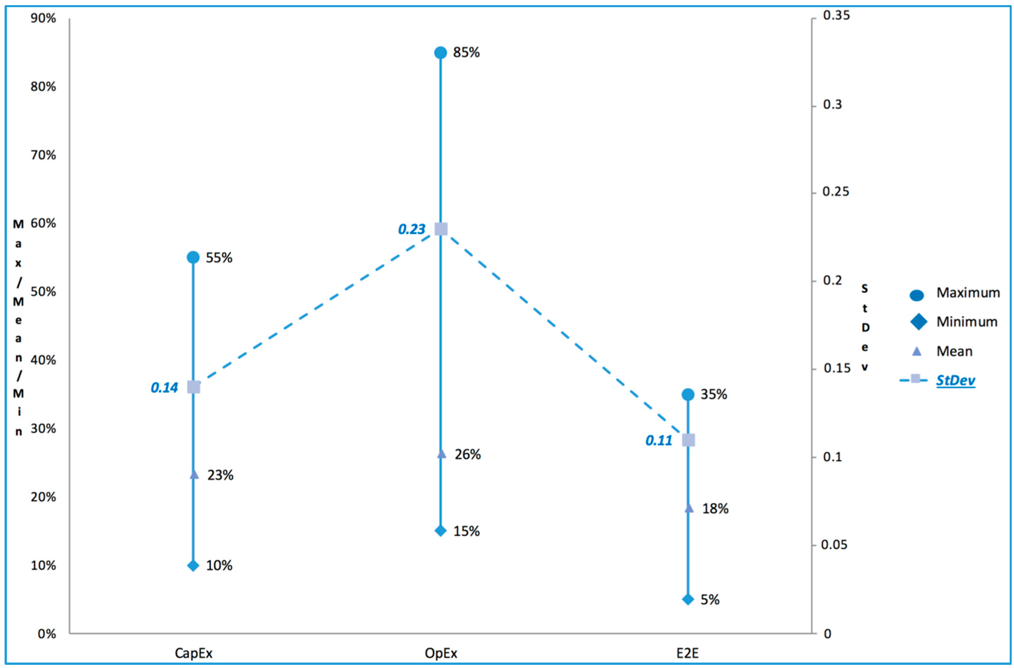 Another LCoE initiative [24] practically substantiates that it is not possible to simply add CapEx and OpEx costs to get to the total costs within the LCoE calculation, because both the development and consent (project development expenditure, DevEx) costs prior to the OWF project final investment decision and the de-commissioning (site abandonment expenditure, AbEx) costs need to be included, as well. It was therefore only possible to review the useful WP logistics cost responses separately within their respective categories as depicted in Figure 5. In doing so, we can conclude that whereas 23% and 36% of CapEx and OpEx costs, respectively, are attributable to logistics, 18% of the E2E OWF project costs across life-cycles and equal to the cost equation of the LCoE can be attributed to logistics. Based on the ambiguity within both the country LCoE definitions themselves and the definition of logistics in its widest application (including the project risk from the U.K. [19] and German [21] LCoE studies), logistics costs of 18% of LCoE must be deemed to be a ’very conservative minimum level‘ according to our research.