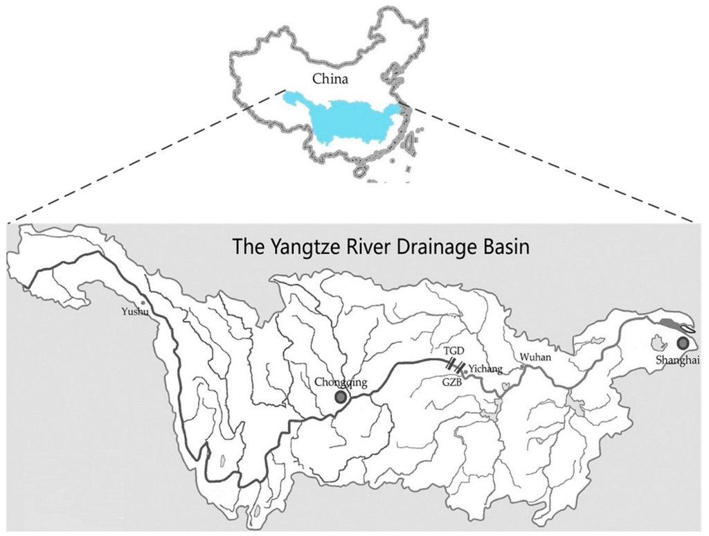 The Yangtze River originates from the Qinghai–Tibet Plateau and flows eastward before debouching into the East China Sea near Shanghai. With a length of about 6300 km, the Yangtze River is China’s longest river and the world’s third longest river. The Yangtze River drains a wide basin of 1.8 million km2, nearly one fifth of China’s territory and home to one third of China’s population. The stretches above Yichang form the upstream of the Yangtze River. The Yangtze River drops 120 m at the mountainous Three Gorges between Chongqing and Yichang. The TGD and GZB are located at the juncture of the upper and middle reaches of the Yangtze River. The TGD is 44 km upstream from Yichang, and the GZB is 38 km downstream from the TGD. Figure 1 shows the Yangtze River drainage basin and the TGD and GZB reservoirs. The TGD–GZB system plays a vitally important role in developing and harnessing the water resources of the Yangtze River as the system provides comprehensive benefits such as flood control, hydropower generation, navigation, sediment control, and water provisioning.