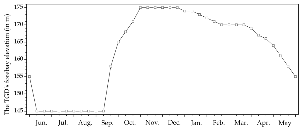 The Yangtze River drainage basin is characterized by a subtropical climate initiated from the southeast Pacific Ocean and the Indian Ocean. The monsoon and precipitation cause seasonal variability in the river’s flow and the flood season is from June to September. Sediment discharge is uneven throughout the year and the quantity in May to October accounts for more than 90% of the annual sediment discharge. Hence, the TGD deals with sediment by lowering the reservoir water level to drain the floods with mud and sand during the flood season and by storing water during the drought season. To be specific, the TGD’s forebay elevation decreases to the flood control limit level (i.e., 145 m) during 1 June and 10 June; until 10 September, the TGD maintains its forebay elevation at 145 m in order to vacate enough storage for the incoming floods; then the TGD starts to impound water and the forebay elevation gradually increases to around 165 m at the end of September and to the normal pool level (i.e., 175 m) at the end of October or the beginning of November; from November to the next year’s May, the TGD gradually draws off water and is operated at high forebay elevations that are no less than the drought season control level (i.e., 155 m); the TGD’s forebay elevation should be no more than 155 m at the end of May. Figure 2 illustrates an example forebay elevation schedule of the TGD following the operation guidelines.