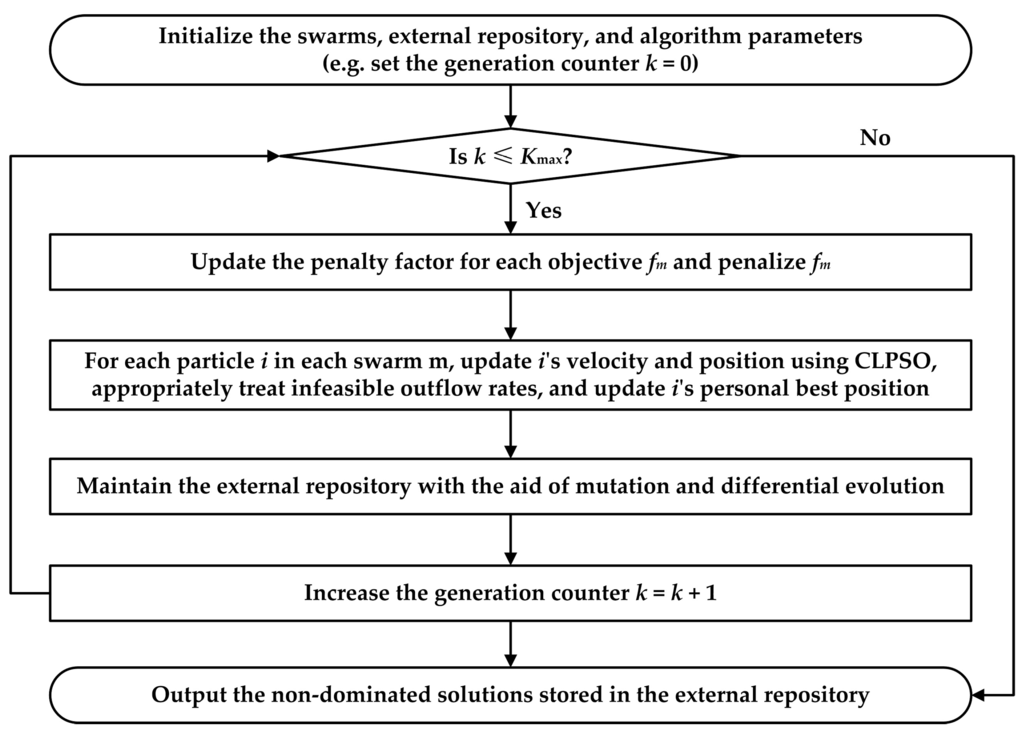 In [1], we have addressed the single-objective operation of multi-reservoir hydropower systems using an optimizer called enhanced CLPSO [23]. Here for the multi-objective application implementation of MSCLPSO, each particle i’s position Posm,i is a vector representing candidate outflow rates of all the reservoirs in all the time steps [1]. The power discharge rate Qi,t and spillage rate Si,t can be conveniently determined from the outflow rate Oi,t [1]. Infeasible outflow rates are appropriately treated, the constrained problem is converted to an unconstrained one through penalizing the constraints, and the penalty factor is dynamically adjusted using the strategies introduced in [1]. The penalty factor parameters (i.e., minimum penalty factor and maximum penalty factor ) could be different for each objective fm. The optimization framework is summarized in Figure 3, where Kmax is the pre-specified maximum number of generations.