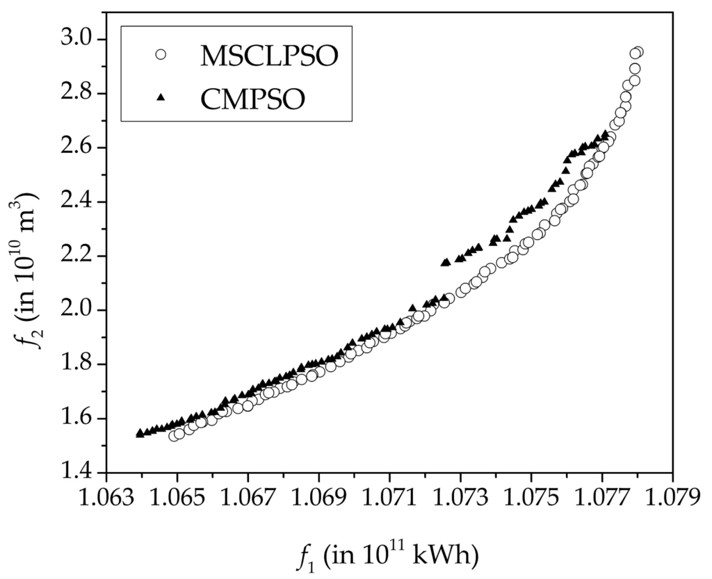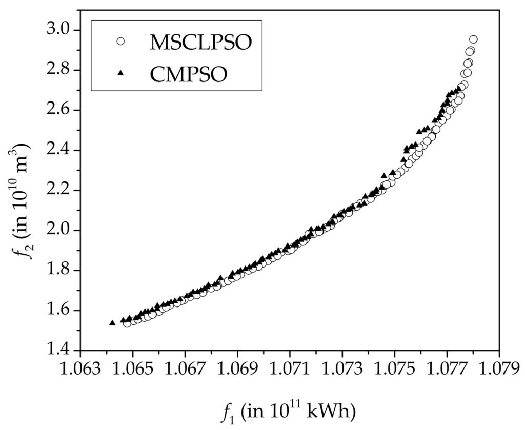 Unless otherwise specified, the algorithm parameters of MSCLPSO and CMPSO respectively take the recommended values specified in [14,15]. The number of particles in each swarm is set as 20. For both algorithms, the dimensional velocity Velm,i,d is clamped to a positive value . If , then Velm,i,d is set to ; or if , then Velm,i,d is set to . Here . For objective f1, the minimum penalty factor and the maximum penalty factor . For objective f2, and . ε-dominance [26] is used and ε = 10,000. The maximum number of elitists Lmax = 100. MSCLPSO and CMPSO are executed for 30 runs, with each run lasting for 10,000 generations. The inflow series in the normal water year 2005–2006 are taken as the hydrological inputs