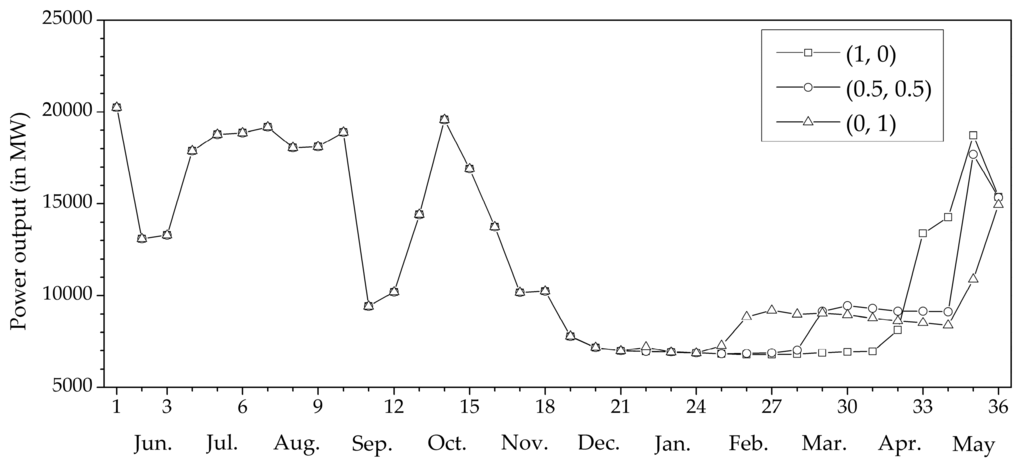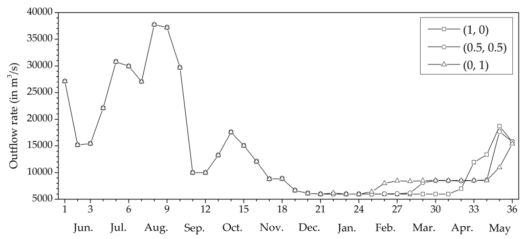 We look at three tradeoffs corresponding to the (1, 0), (0.5, 0.5,) and (0, 1) weight combinations selected by the TOPSIS approach. The objective values of the three tradeoffs are listed in Table 5. Figure 6 and Figure 7 respectively depict the TGD–GZB system’s outflow rates and power outputs of the three tradeoffs. As can be observed from Figure 6 and Figure 7, the three tradeoffs differ in the outflow rates only for the period from February to May. The (1, 0)-tradeoff keeps the outflow rates around the lower bound (i.e., 6000 m3/s) in February, March and early April. The (0.5, 0.5)-tradeoff starts increasing the outflow rate in March, while the (0, 1)-tradeoff starts increasing in February. Hydropower generation is dependent on both power discharge rate and water head. The (0.5, 0.5)-tradeoff and (0, 1)-tradeoff discharge more water than the (1, 0)-tradeoff between February and mid April, hence leading to more hydropower generation in that period. However, for the (0.5, 0.5)-tradeoff and (0, 1)-tradeoff, less storage is left after mid April and hence the two tradeoffs discharge significantly less water than the (1, 0)-tradeoff between late April and mid May. As a result, the (1, 0)-tradeoff still generates the largest amount of electricity over the planning horizon.