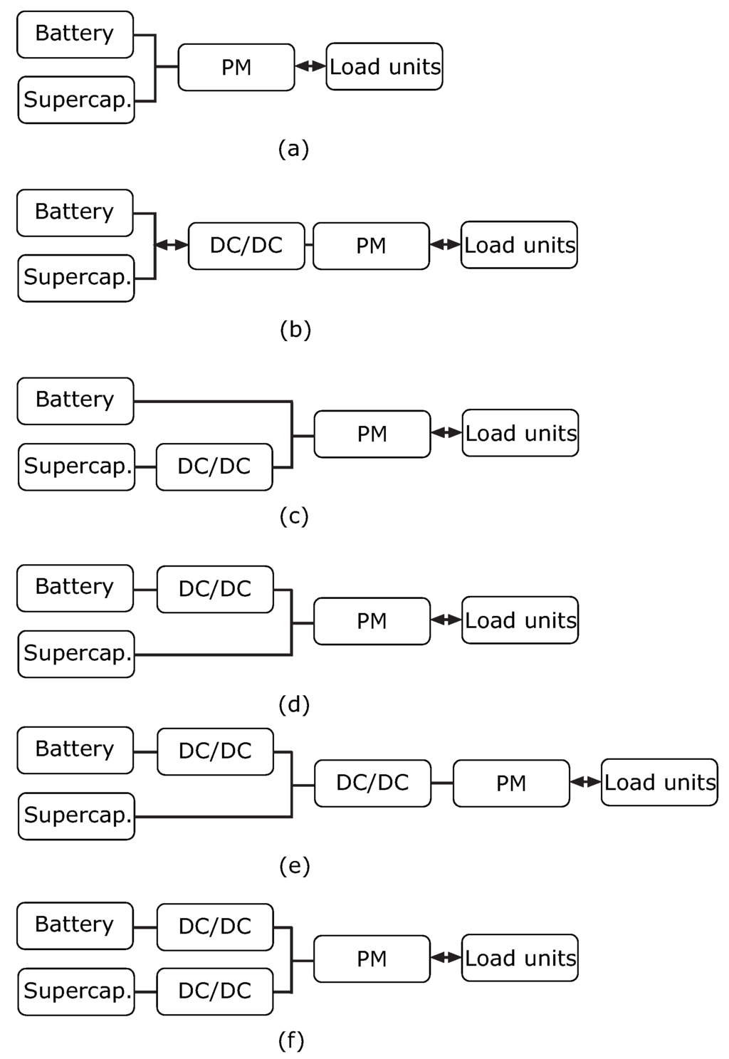 Typical topologies in electrical powertrains: (a) passive; (b) parallel semi-active; (c) capacitor semi-active; (d) battery semi-active; (e) series active; (f) parallel active (PM refers to power management, supercap. refers to supercapacitor).