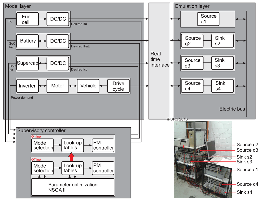 The paper is organized as follows: the topologies with HESS are briefly introduced followed by the configuration chosen for this contribution; next, the modeling and sizing of powertrain components is detailed followed by a verification of their dynamics based on the literature; next, the concept of emulation is described followed by a possibility to realize powertrain dynamics with controllable sources and sinks; in the next section, the developed power management optimization concept is explained in detail. The operation of the different blocks and the interactions between them is described. Finally, the simulation and emulation results are presented followed by a summary and conclusions.