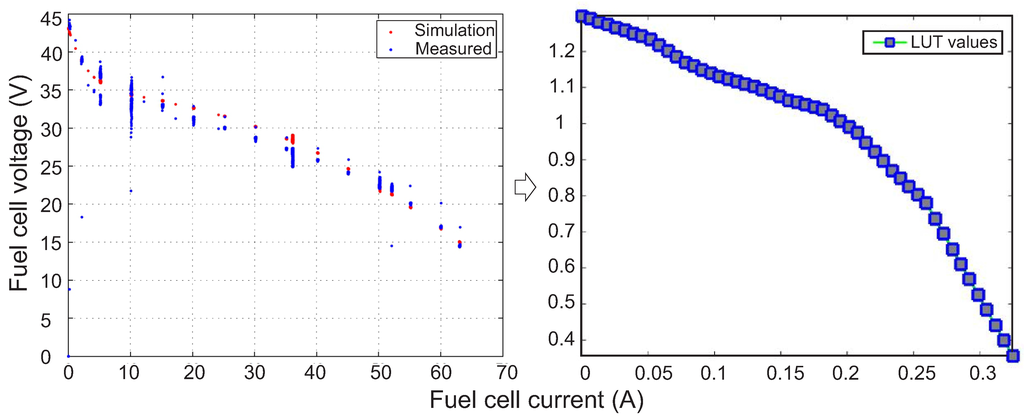 Based on the results obtained in [28], a fuel cell model based on look-up tables (LUTs) has been considered in this work. The used LUTs represent the fuel cell voltage-current, and efficiency-power relations are shown in Figure 3 and Figure 4, respectively.