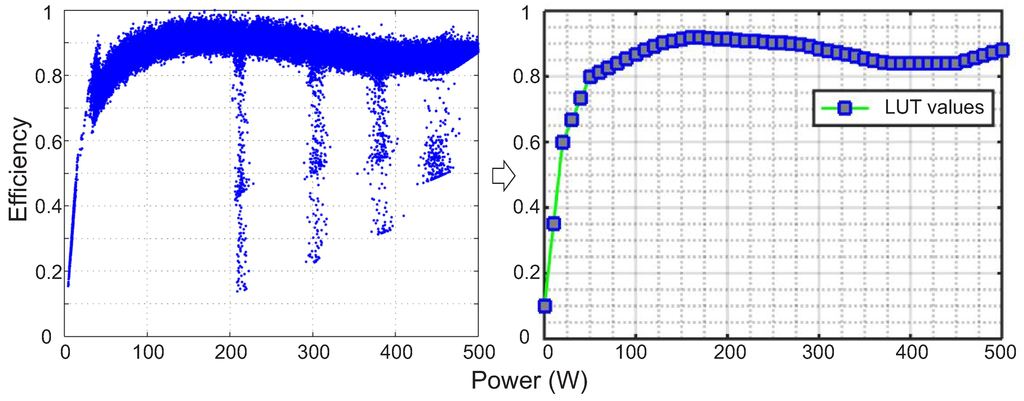 Thus, the state space form of DC/DC converter model has a linear system matrix and a non-linear system matrix , which is dependent on the duty cycle D. According to [39], the DC/DC converter can be internally controlled by a PI-controller with bus voltage as the reference input, and externally, it can be controlled by the power management controller that sends the required current output signal to the converter. The switching losses of the DC/DC converter can be calculated based on a LUT, which is based on validated results from [40]. From this LUT, the energy conversion efficiency can be calculated. Using: