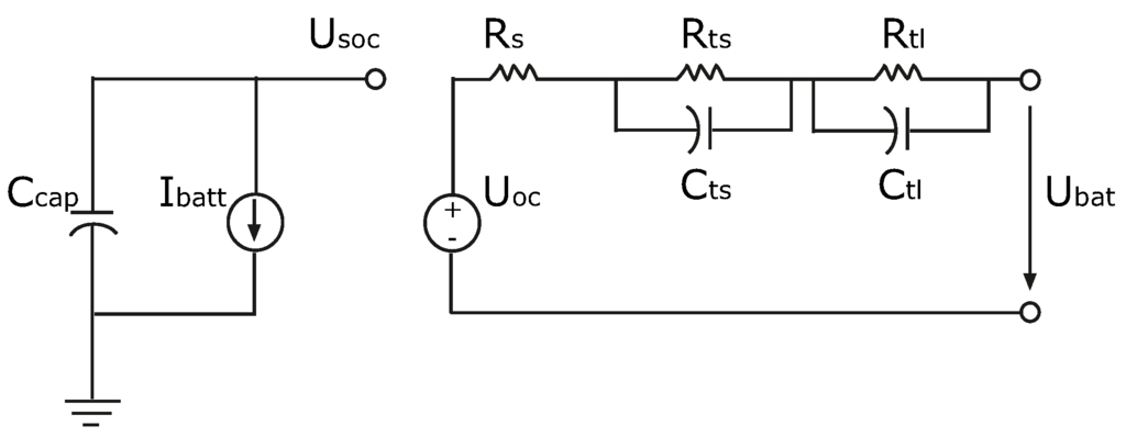 In this work, a Li-ion battery is chosen, and the battery is modeled using a dynamic modeling approach according to [34,35]. With the help of dynamic models, the transient behavior of the battery can be described [9]. Inductive and capacitive effects are taken into account, and a model-based determination of SoC is possible [9]. The circuit diagram is shown in Figure 5. In one circuit, the overall capacity of the battery is represented, while in the other, the internal resistance and other dynamic effects. The SoC of the battery is determined from the total capacity and the battery current .