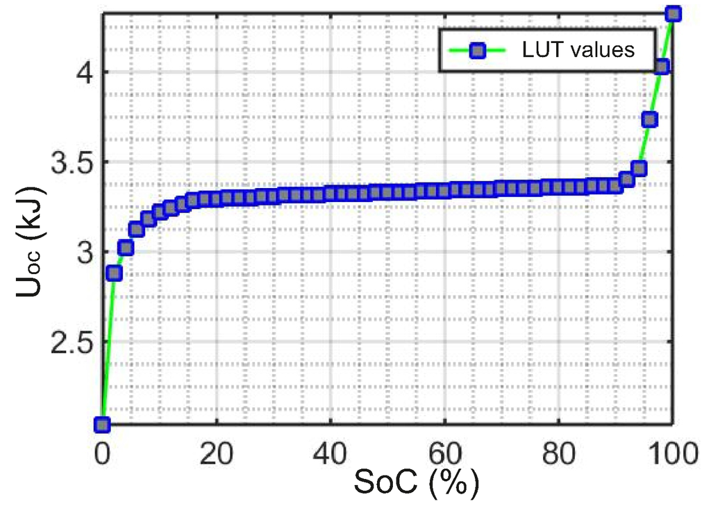 The voltage source linking the two circuits, represents the non-linear relation between the battery state of charge and open circuit voltage . This non-linear relation between SoC and using 33 cells can be represented by a LUT, as shown in Figure 6.