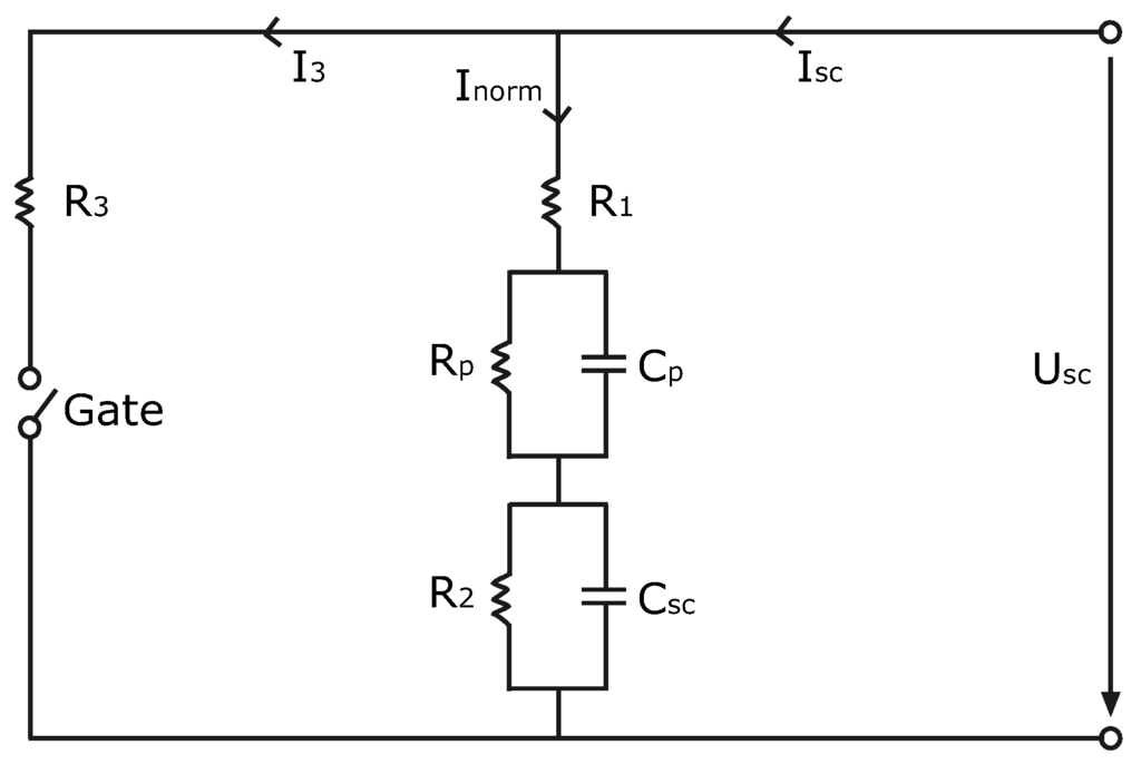 The supercapacitor model considered in this work is based on the models used in [37,38]. As shown in Figure 7, the main capacitance is connected in parallel to a resistance , which represents the self-discharge of supercapacitors. The RCnetwork is connected to another RC network consisting of capacitance and resistance . The charge/discharge losses are represented by the resistance , and the resistance used for protecting the supercapacitor against overcharge is represented by . Considering that the switch is open,