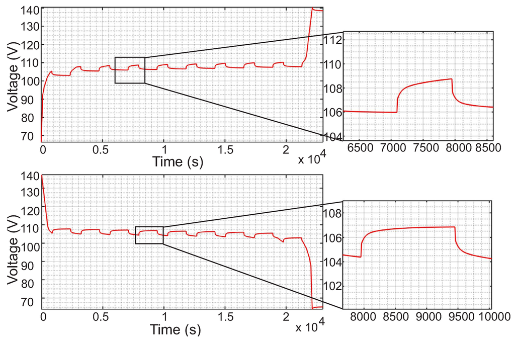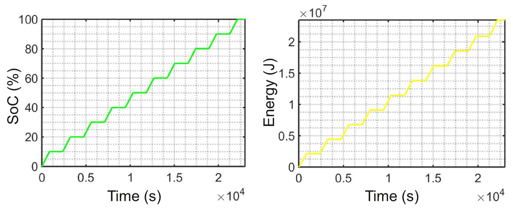 To verify the dynamic behavior of the simulated model, the results are compared to experimentally-validated models of [34,35,36,42]. The battery is first fully charged then fully discharged in a cyclic manner. A constant current of A is applied till the next SoC level ( = 10%, 20%, ... , 90%) is reached. At the next SoC level, current is turned off, then turned on again after a 25-min pause. The voltage variation resulting from the SoC- relationship (Figure 6) is similar to that discussed in the literature. In Figure 9, the voltage variation while the battery is charging is shown. At the moment when the current is turned off, the resulting voltage curve exhibits an initial peak followed by a gradual logarithmic decay. Similarly, when the current is turned on again, a short dip in voltage is followed by a gradual increase. As shown in Figure 9, this behavior is inverted during the discharging process. In Figure 10, the SoC variation is shown. The SoC and energy saved in the battery increase continuously with each charge cycle. In reality, the energy supplied to the battery is not always the same as the energy that the battery is capable of supplying. The supplied energy or the power required to charge the battery depends on the battery voltage. During the charge-discharge cycles, a part of this energy is lost in irreversible chemical processes.