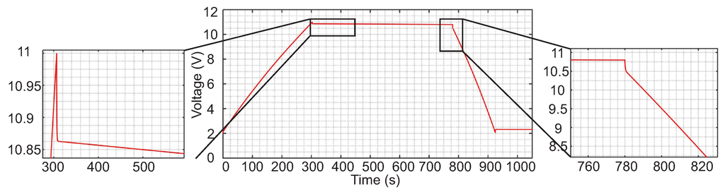 The extraction of model parameters is done based on a real supercapacitor model [37]. The data available from manufacturers are: nominal voltage: 14 V, nominal capacity: 350 F; mass: 24 kg. In [37], constant current tests are carried out with the real supercapacitor by connecting it to a programmable load. The supercapacitor is charged at 10 A until the voltage reaches 11 V, then the current is cut off for about 10 min, and a constant current discharge phase follows at −20 A. For the calculation of , the time period when the voltage rise from 2 V–9 V is chosen, namely s − 46 s = 209 s. Therefore,