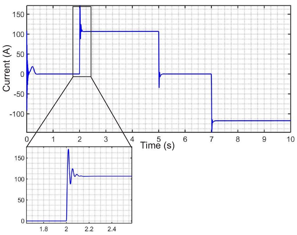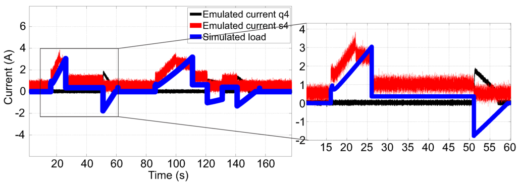 Here, the emulation of both positive and negative parts of the load demand by is given. During the positive half of the load cycle, current is drawn by the sink (motor mode), and in the negative half of the load cycle, power is supplied by the source (generator mode). Therefore, the emulated current, which is an absolute value, can be seen as an inversion of simulated value. From Figure 15 and Figure 20, a good coincidence between model behavior and emulation can be noted. Thus, the dynamics of the simulated models of components together with the supervisory controller can be realized using the emulated experimental setup. Corresponding to the three sources, the DC/DC converter current outputs as defined by the power management controller are sent to , and . The simulated load current from the backward modeled part is sent to .