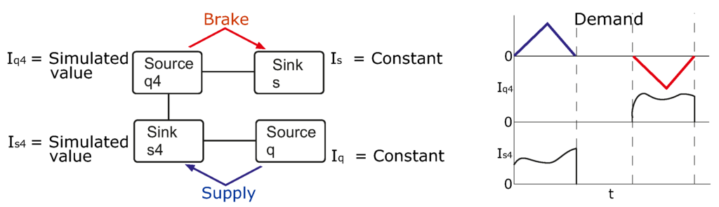 In this subsection the effect of the developed power management control concept is discussed. From Figure 20a, the basic working principles of the power management strategy become clear using an NEDC drive cycle as the example. The battery current is limited, and the more dynamic fluctuations are taken over by the supercapacitor. The fuel cell is operated close to its efficient operating point as calculated in [28]. To evaluate the feasibility of the emulation hardware in realizing the dynamics of the powertrain, the simulated results are compared to emulation results. In Figure 20b, the charging of the battery and supercapacitor is shown. This is in accordance with the simulated battery and supercapacitor current, as shown in Figure 20a. The curves in Figure 20b demonstrate an inversion of the values shown in Figure 20a. The negative parts of load represent charging or an increase in sink and currents and positive parts, discharging or an increase in source and currents. Here, only the emulation of charging current is shown. Similarly, the emulation of supply and regeneration dynamics using s and q is explained with Figure 15.