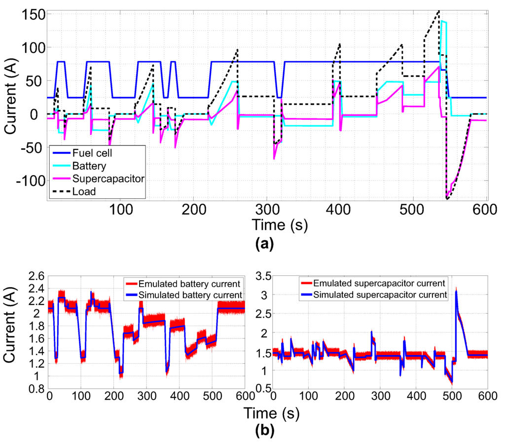 (a) Simulated source and load current; (b) experimentally-emulated battery and supercapacitor current.