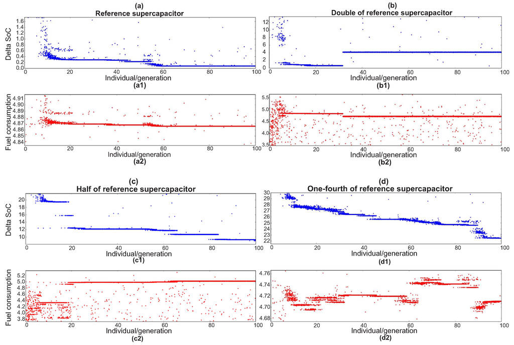 To demonstrate (and to learn about) the principal behaviors, four supercapacitor sizes are chosen for comparison: the reference, double the reference, half the reference and one-fourth the reference. The optimization runs for all of the supercapacitor sizes can be seen in Figure 21. As shown in Figure 21b, with the double-sized supercapacitor, a slight improvement in fuel consumption values is noted (Figure 21b2) at the cost of the deterioration of values (Figure 21b1). However, this does not provide an optimal solution for the total objective function, and further iteration steps of the optimization algorithm are required. As shown in Figure 21c, with the half-sized supercapacitor, a prominent improvement in is noted (Figure 21c1). The fuel consumption is not minimized within the shown iteration steps. Finally, in Figure 21d, with one-fourth the supercapacitor, dynamic and fluctuating behavior is noted in Figure 21d1,d2. Within the shown iteration steps, minimization, particularly of fuel consumption values, is not possible. Thus, with such small supercapacitor sizes, the control task is difficult, and the overall system might become unstable.