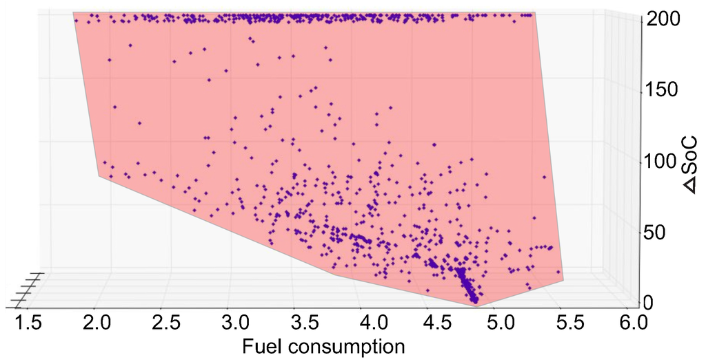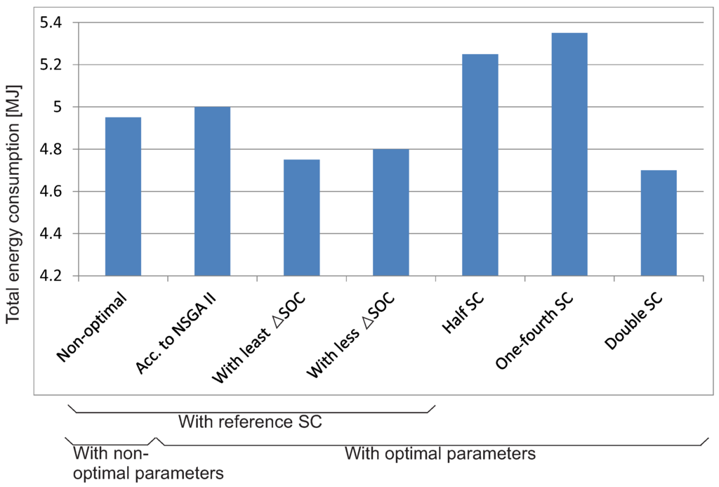 In Figure 22, conflicting solutions for the two objective functions for the reference supercapacitor can be seen. This results from the principle contradictions in the task of fuel consumption minimization and SoC sustenance. However, a convergence of the total objective function can be obtained. From Figure 22, it can be noted that although minimum values for are obtained, the values chosen for fuel consumption are not necessarily the minimum values. Lower fuel consumption values that did not satisfy the minimum are rejected, so a compromising solution for both objectives can be obtained.