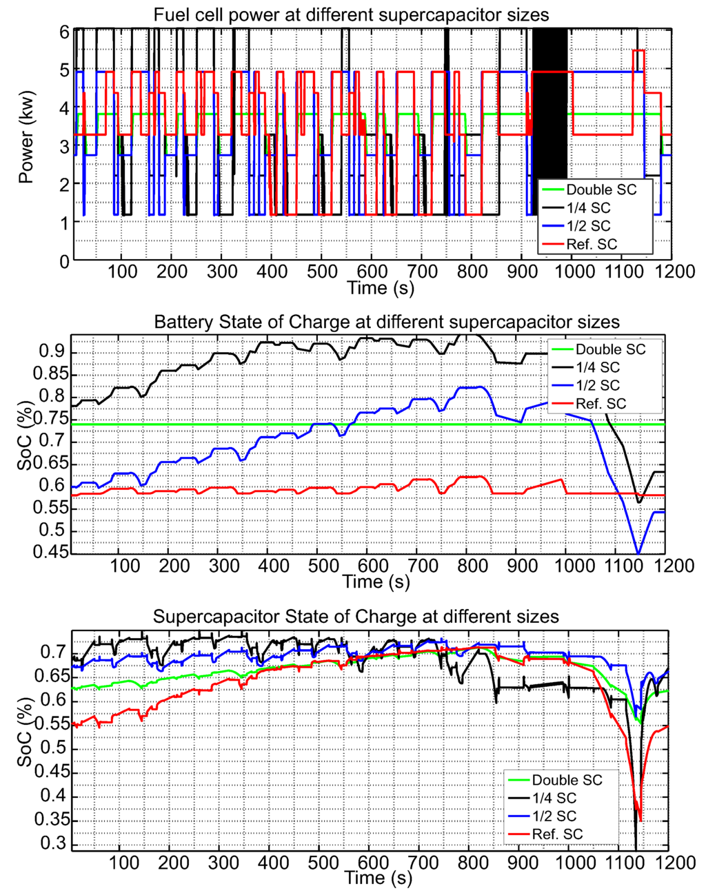Smaller supercapacitors: From the battery SoC, it can be seen that the battery is gradually charged in the beginning, so as to gain reserves for following the high demanding part of the drive cycle, due to the insufficient storage capacity of the supercapacitor. Then, the battery is discharged till its lowest SoC value. From the supercapacitor SoC, it can be seen that smaller sizes cause more fluctuations. With the one-fourth size, the response is very dynamic. From the fuel cell output power, it can be seen that power supplied by the fuel cell is more for smaller supercapacitors than larger ones. Transient behavior is noted with the smallest supercapacitor.