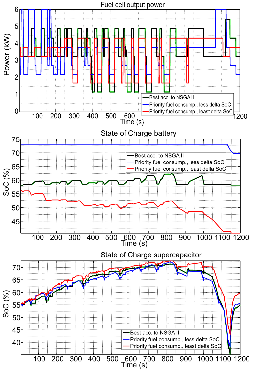 Next, the priority between the two objectives is varied for the reference supercapacitor. For the realization of different requirements, the priorities are assigned as given in the following three cases: Case 1: priority distribution decided by NSGA II (denoted in green); Case 2: high priority on fuel consumption and less priority on (denoted in blue); Case 3: high priority on fuel consumption with least priority on (denoted in red). These three cases can be obtained by analyzing the effects of parameter changes during different stages of optimization. In the first case, the parameters correspond to those obtained at the end of optimization. In the second and third cases, the parameters correspond to those obtained in the intermediate stages. In Figure 24, the SoC variations of the battery and supercapacitor can be seen along with the corresponding fuel cell power.