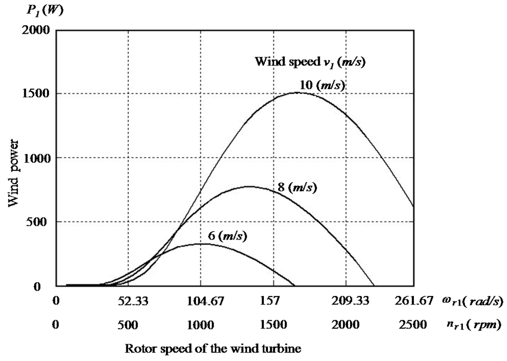 Two characteristic curves of the wind power versus rotor speed for WT with three-blade horizontal axis type at different wind speeds in steady state are shown in Figure 1 and Figure 2. According to aerodynamic principle [1,4,5,6,7], the tip speed ratio β of the WT can be expressed as: