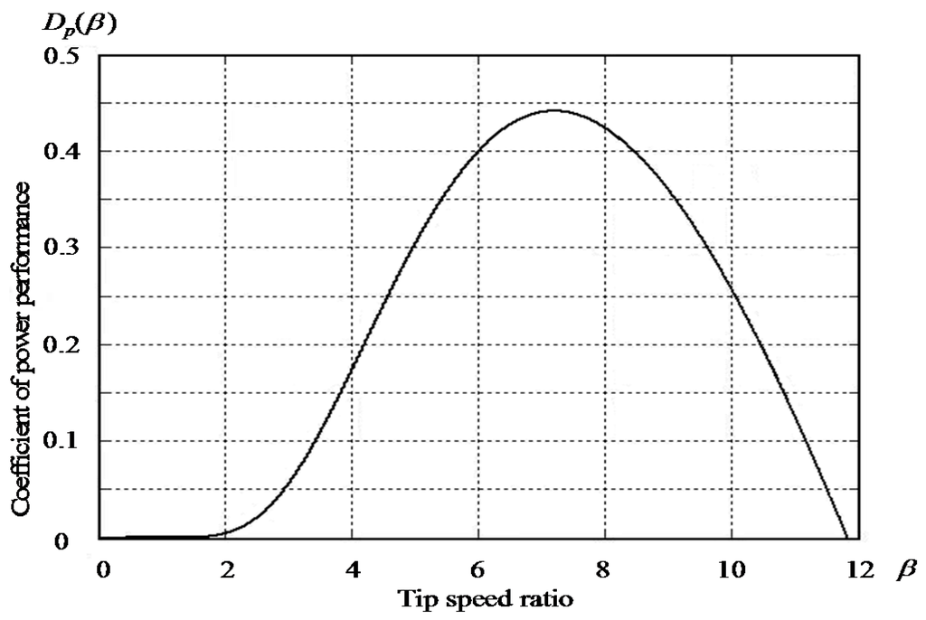 Characteristic curve of coefficient of power performance versus tip ratio β for WT.