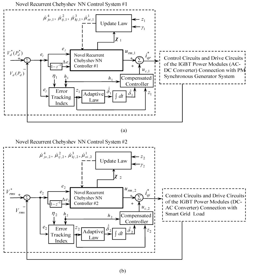 In order to efficiently control the output voltage of the PM synchronous generator system via the rectifier and the inverter, a block diagram of the novel recurrent Chebyshev NN control system with two sets of novel recurrent Chebyshev NNs as shown in Figure 4 is introduced in this paper.