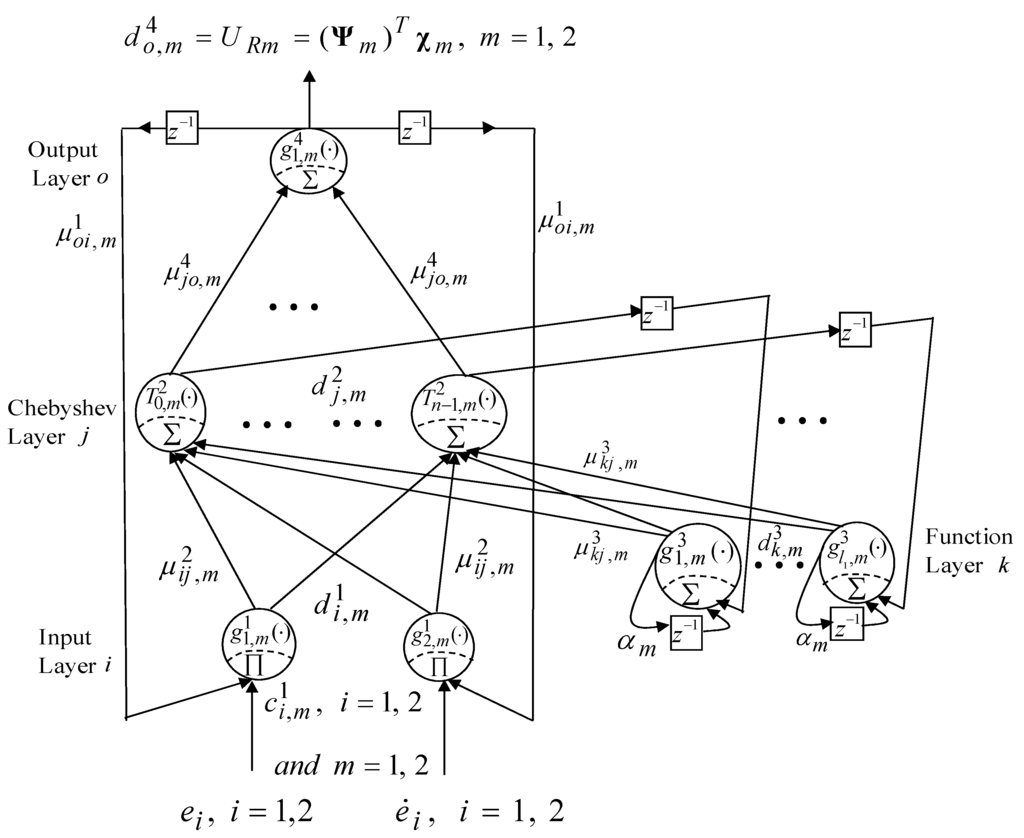 where is the connective weights between the function layer and the output layer in the mth novel recurrent Chebyshev NN (i.e., the output action intensity of the oth output associated with the jth node in the mth novel recurrent Chebyshev NN), and is the jth output node of Chebyshev layer in the mth novel recurrent Chebyshev NN. The single node oth in this layer is indicated as summation. The output in the mth novel recurrent Chebyshev NN can be can be expressed as: