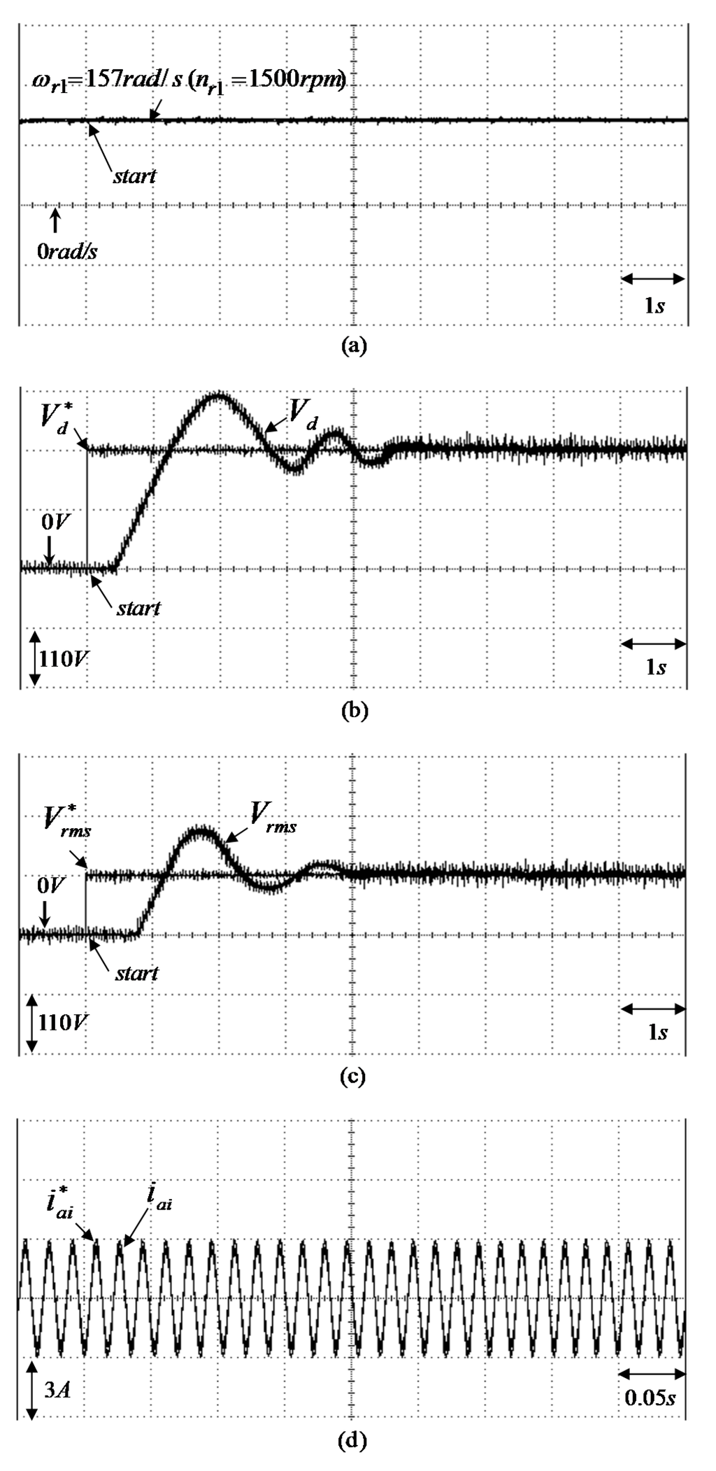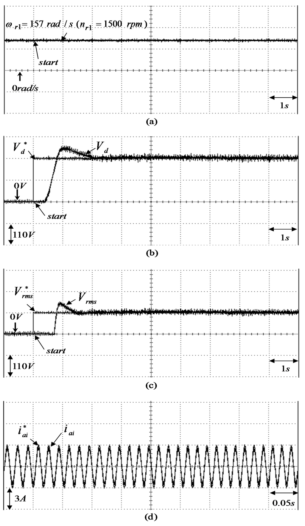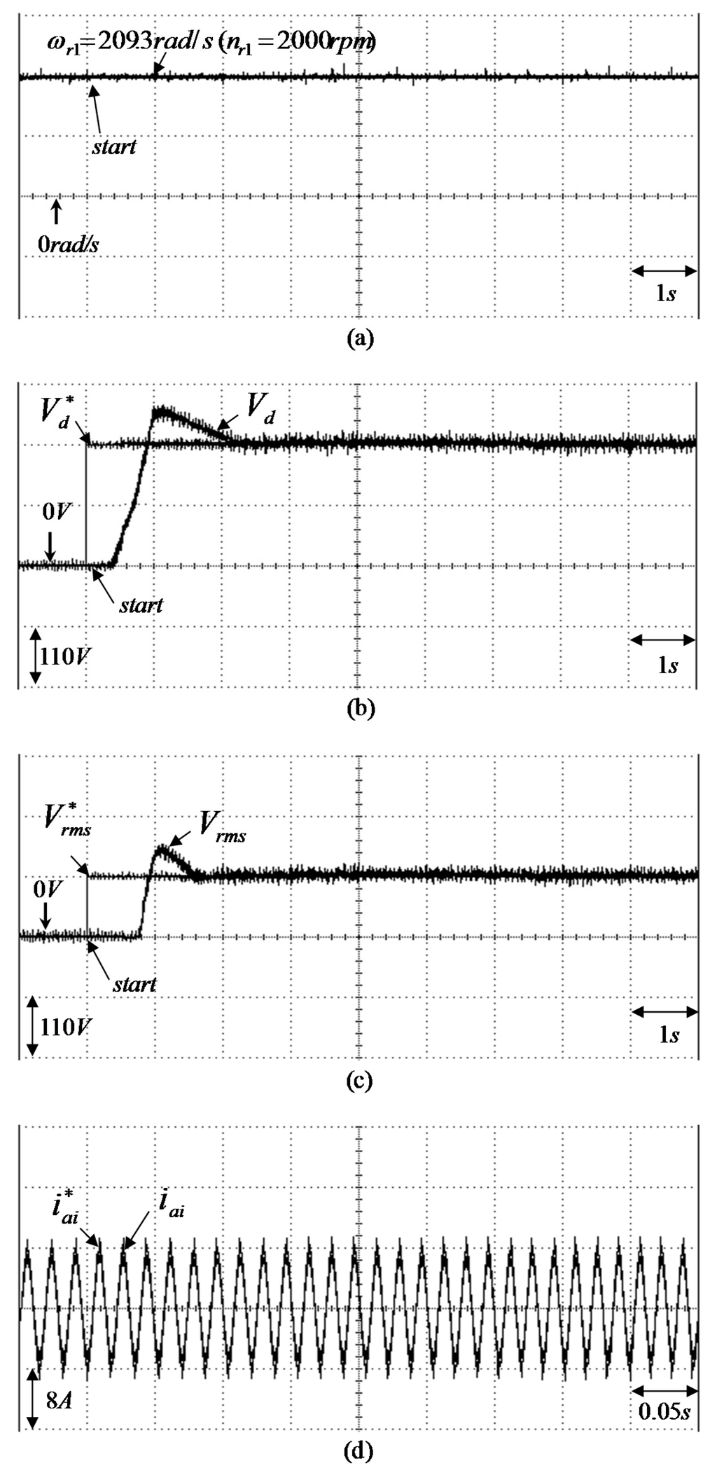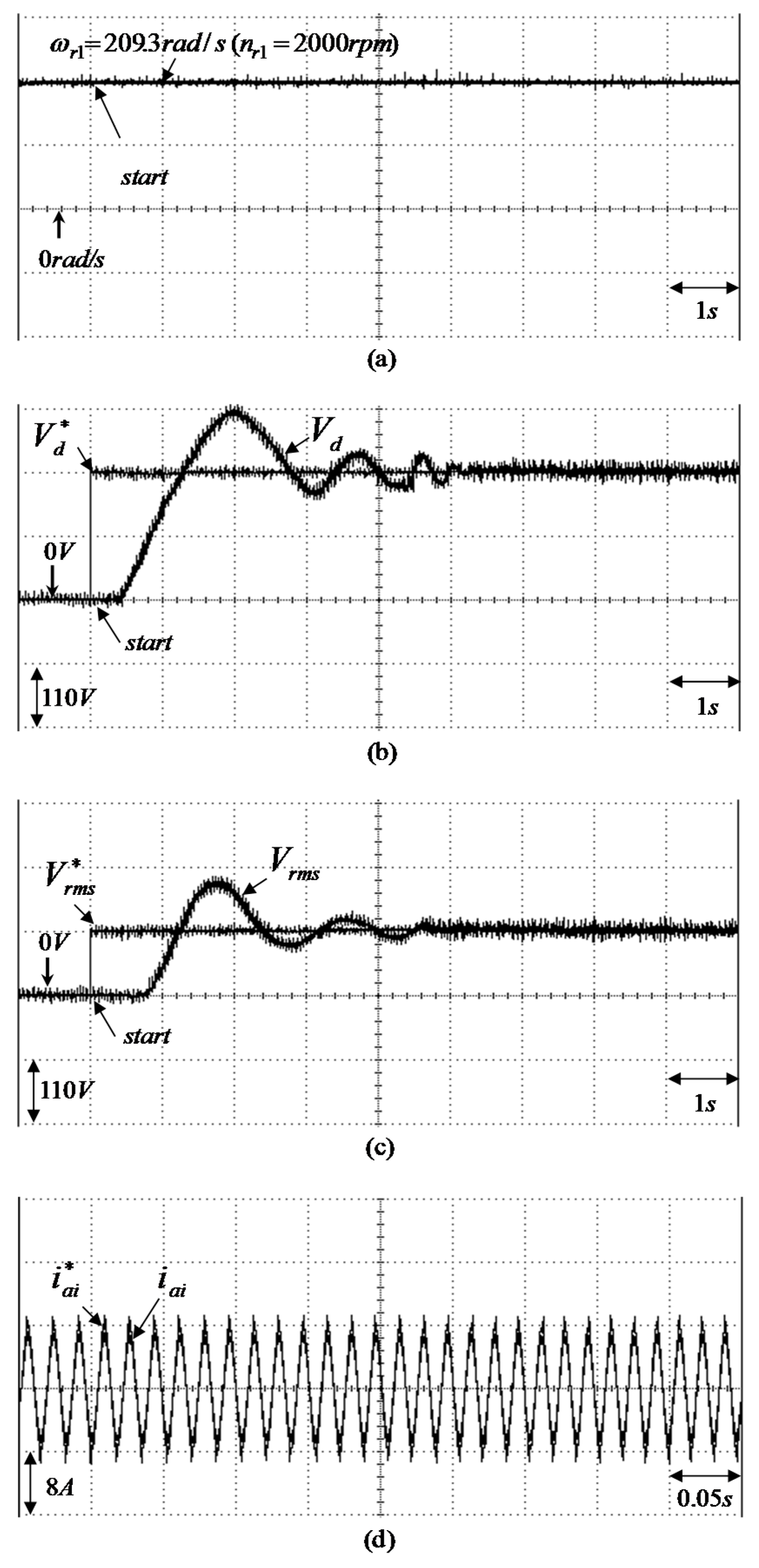 Experimental results of the WT driving PM synchronous generator system using two sets of PI controllers under heavy load (i.e., Δ connection three-phase load of ) for = ( = ): (a) rotor speed ; (b) adjusting response of step desired DC bus voltage and measured DC bus voltage in output end of the AC-DC converter; (c) adjusting response of step desired root-mean-square AC 60Hz line voltage and measured root-mean-square AC 60 Hz line voltage in output end of the DC-AC converter; (d) tracking response of the desired phase current and measured phase current in phase ai of the DC-AC converter.
