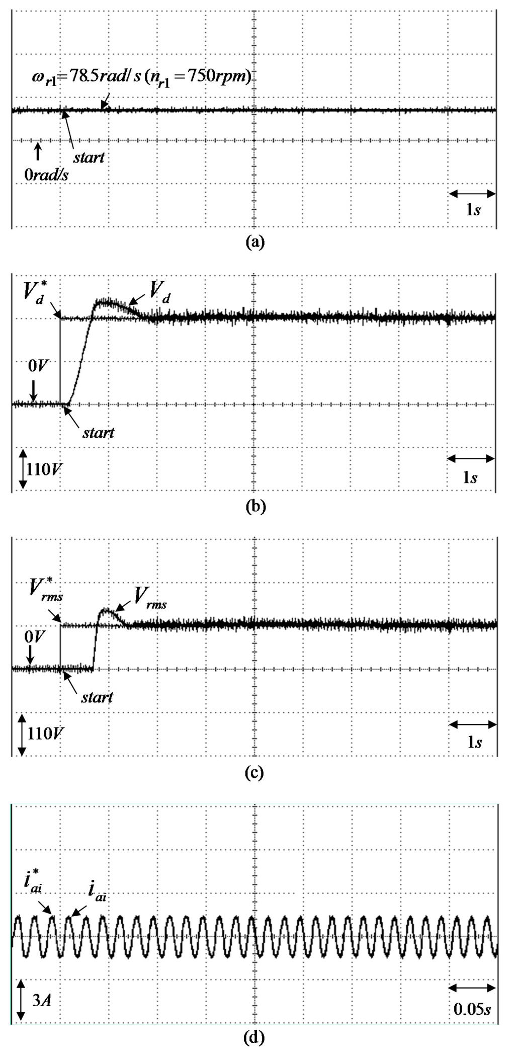 Experimental results of the WT driving PM synchronous generator system using two sets of PI controllers under light load (i.e., Δ connection three-phase load of ) for = 78.5 rad/s (= 750 rpm): (a) rotor speed ; (b) adjusting response of step desired DC bus voltage and measured DC bus voltage in output end of the AC-DC converter; (c) adjusting response of step desired root-mean-square AC 60 Hz line voltage and measured root-mean-square AC 60 Hz line voltage in output end of the DC-AC converter; (d) tracking response of the desired phase current and measured phase current in phase ai of the DC-AC converter.