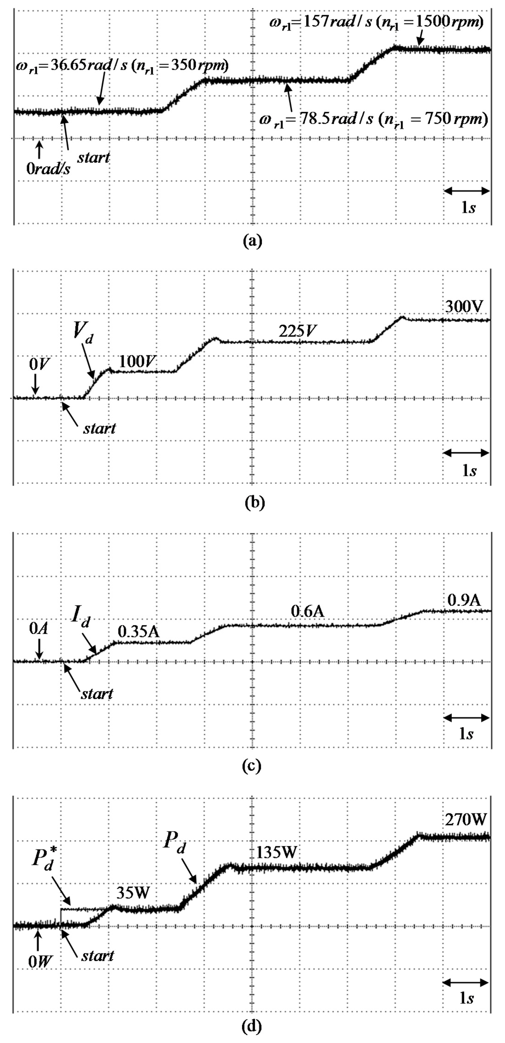 Experimental results of the WT driving PM synchronous generator system using the novel recurrent Chebyshev NN control system at step-command changing of rotor speed: (a) rotor speed ; (b) response of measured DC bus voltage ; (c) response of measured DC bus current ; (d) response of reference DC bus power and DC bus power .