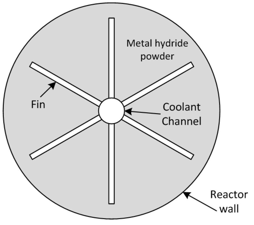 The hydride powder itself possesses a low thermal conductivity value, and to this end various research groups have developed methods for improving heat transfer capacity of the material. From efforts to enhance the inherent thermal conductivity of the metal hydride powder [,,,,,] to metal compacts pressed at high pressure [] and to pellet-shaped geometries known as porous metal hydride [], all of these advances require sintering under high pressure and the use of an organic binder. However, these technologies require an additional material process and deteriorate the mass transfer of H2 attributed to decreased permeability. Coolant channels or heat transfer fins have been considered because they increase the heat transfer area without creating the aforementioned issues. Transverse or longitudinal cooling fins were used in tubular and box-shaped reactors [,,,]. A plate-fin type heat exchanger in a rectangular reactor has been experimentally tested []. For a tubular reactor, three designs (coolant channels with fins, helical coils, and shell-and-tube) have been optimized and compared []. Another study compared a straight channel with a helical coil for internal cooling and also investigated cooling performance improvements by the addition of external transversal fins []. A systematic optimization routine for internal fin design was performed to determine geometrical parameters [].