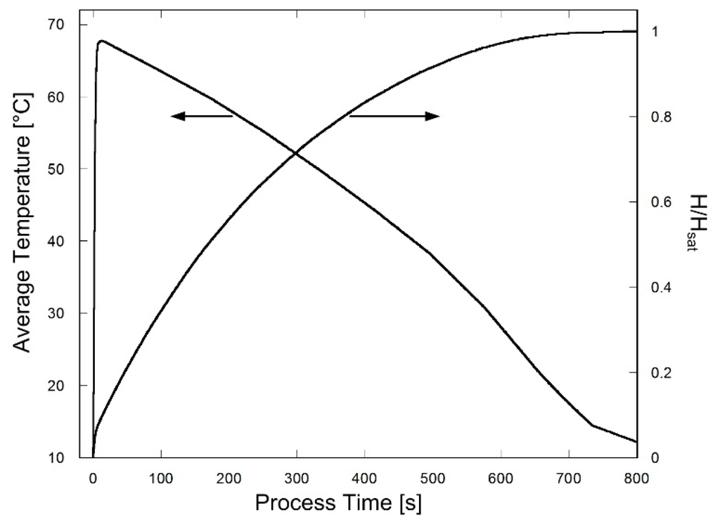 Figure 2 describes the simulation results of the hydriding process for the case of 8 fins without the external convection on the outer surface of the reactor wall. The volume averaged temperature of metal hydride powder and the ratio of mass of absorbed H2 to the saturation mass (H/Hsat) are plotted in the left and right ordinates, respectively.