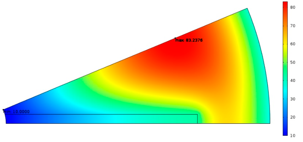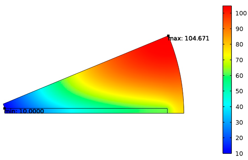 The optimization incorporates the study of all the design conditions described in the previous sections, taking into consideration specifically the number of fins and their aspect ratio. This report maintains a volume fraction of φ = 0.1 in the calculations, which is defined as the volume occupied by the fins over the total volume occupied by the metal hydride powder if no fins are present. As such, the cross-sectional area of all fins is defined by φπ, where and are the outer radius of the central cooling tube and the inner radius of the reactor wall, respectively. The optimization begins with the determination of the most suitable aspect ratio with a fixed number of fins. Here, the COMSOL multi-physics simulation software is used to calculate the transition heat transfer numerically with a model using more than 1,000 individual elements, a time step of 0.1 s, and a dimensional tolerance of 10−8 m. The mesh size was determined such that the relative error of numerical results fell within 1% when the mesh size was halved at every step. An example of the thermal distribution on the reactor cross section is displayed in Figure 3. This eight-fin reactor has an aspect ratio (AR) of 0.06048 (2.419 mm × 40.00 mm). Figure 3, which exhibits temperatures 60 s after the hydriding process, illustrates that the minimum temperature is located at the center of the cooling cylinder, while the maximum temperature is at the inner surface of the reactor wall. In order to minimize the computational load for the simulation, only half of the fin geometry is analyzed below. As the fin is symmetrical about the longitudinal axis, this is a sound practice.