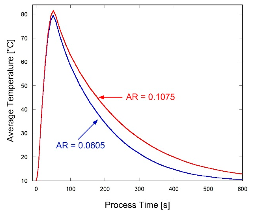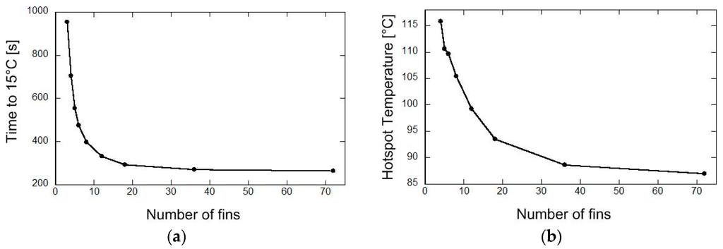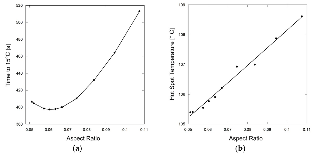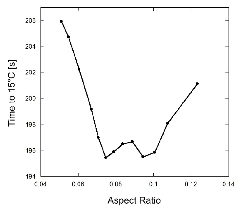 The results of the COMSOL simulation on the eight-fin design are plotted in Figure 5, where it is clear to see that the optimal AR is located at the lowest region of the parabolic curve. For example, in the Figure 5a graph, the optimum design in terms of time needed to achieve cooling to 15 °C is found at an AR of 0.0605, with a corresponding cooling time of 397 s. An examination of the hotspot temperature curve shown in Figure 5b illustrates that the observed hotspot temperature has a minimum value of 105.4 °C for AR = 0.0511, compared with the maximum value of 108.7 °C at an AR of 0.1075. This range of values between minimum and maximum temperatures illustrates that a reduction in hotspot temperature by 3.3 °C can be achieved with simple modifications to fin geometry.