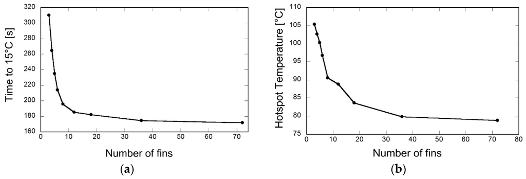 When considering the optimum number of fins to reach 15 °C during cooling, this simulation analyzes the procedure in a similar method to what was described in Section 3.2. Figure 9a illustrates the results of this analysis, which yields a cooling performance curve similar to that of Figure 6a. The number of fins analyzed for this simulation are N = 3, 4, 5, 6, 8, 12, 18, 36, and 72 fins.