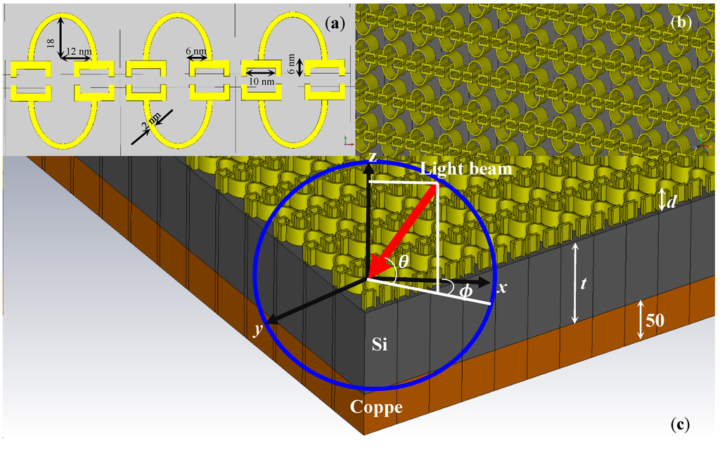 The spherical coordinate in Figure 1c is purposely illustrated to feature the trace of the incoming light beam along with the -direction. The importance of it lies in that the metasurface is essentially an anisotropic medium, and the spectral behavior (of MPA) is analyzed when the incident angle sweeps a wide range under transverse electric (TE) and transverse magnetic (TM) polarizations (of the incidence excitation). Also, in some cases, the results are obtained corresponding to the two different values of the azimuthal angle (viz. and ), in order to illustrate the effect of on the absorption characteristics. The scattering matrix, developed by the CST simulator, is used to analyze the frequency-dependent absorption of the MPA structure; the detector is essentially considered as placed below the copper nanolayer.