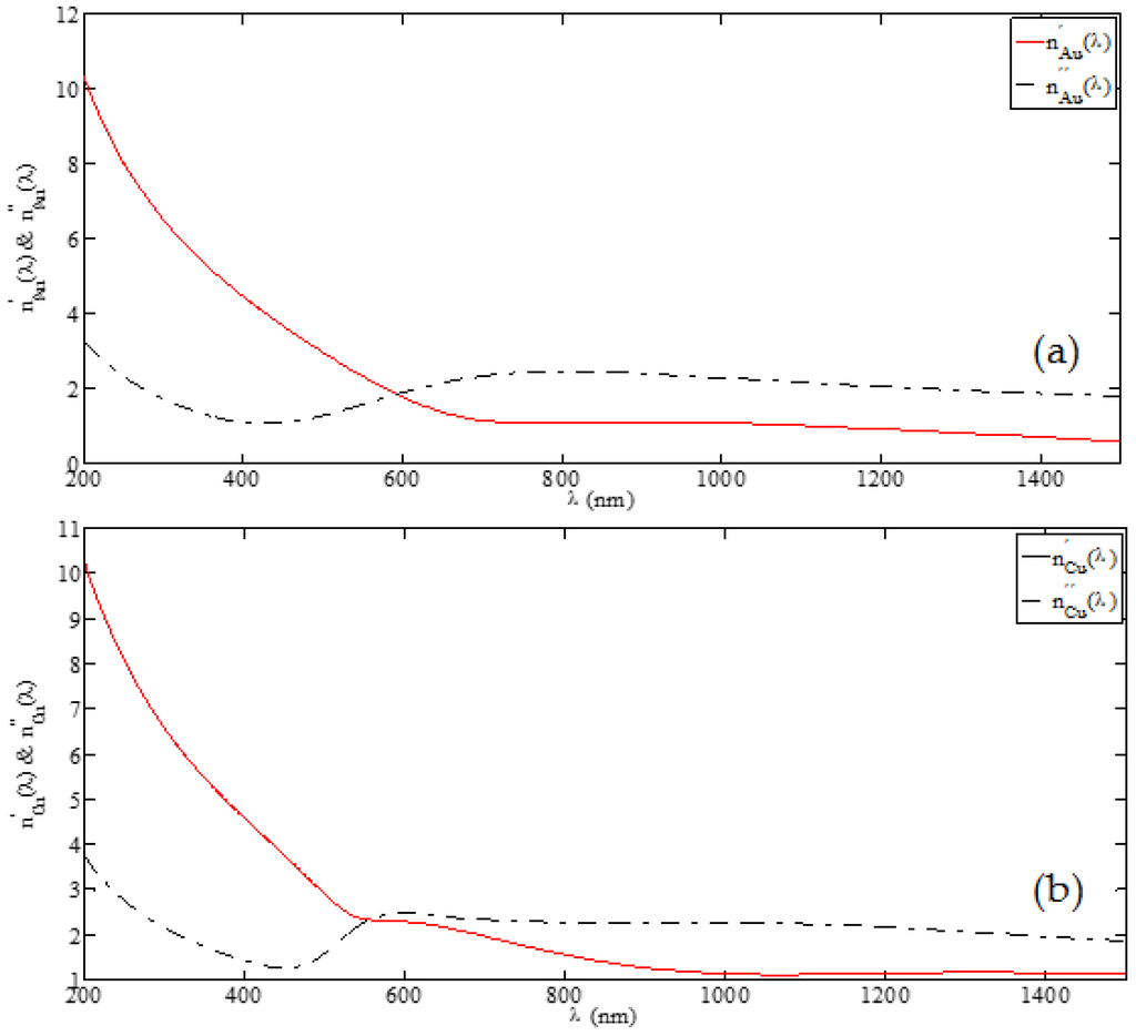 Figure 2 illustrates the refractive index (RI) dependence of gold and copper on the wavelength in the NUV and NIR regions (200–1500 nm) of the EM spectrum. Since the RI values remain complex in nature, we represent those in the cases of gold (Au) and copper (Cu) as and , respectively. Further the RI value of Si is taken as . It is clear from Figure 2 that gold and copper both exhibit decrease in RI with increasing wavelength, and for higher wavelengths, the RI values become almost independent (of wavelength). Also, the imaginary part of RI remains larger for higher wavelengths.