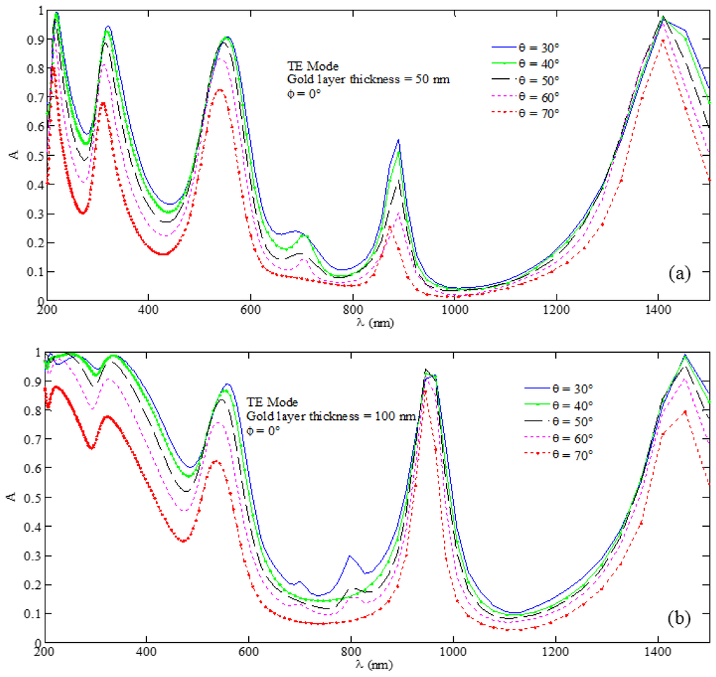 Absorption spectra obtained for under the TE wave excitation incidence and corresponding to (a) nm and (b) nm.