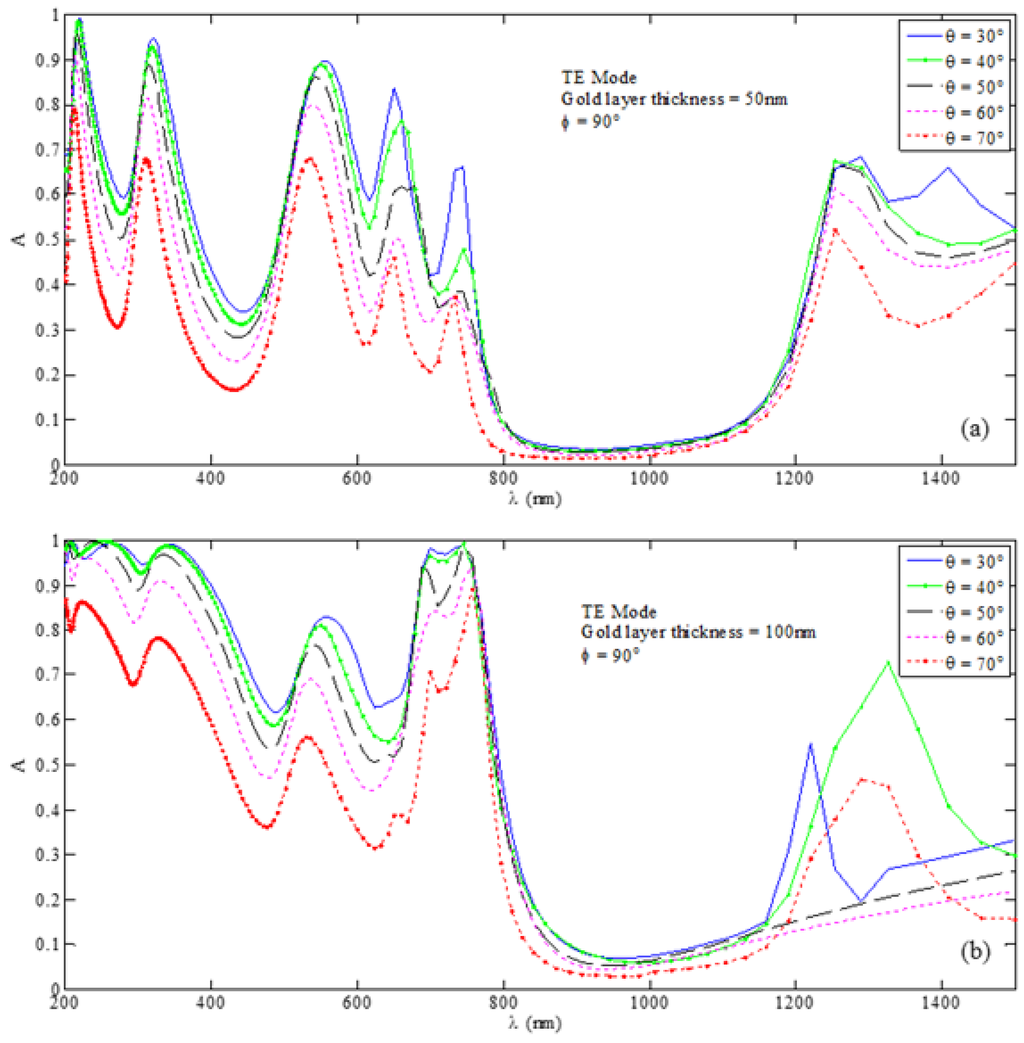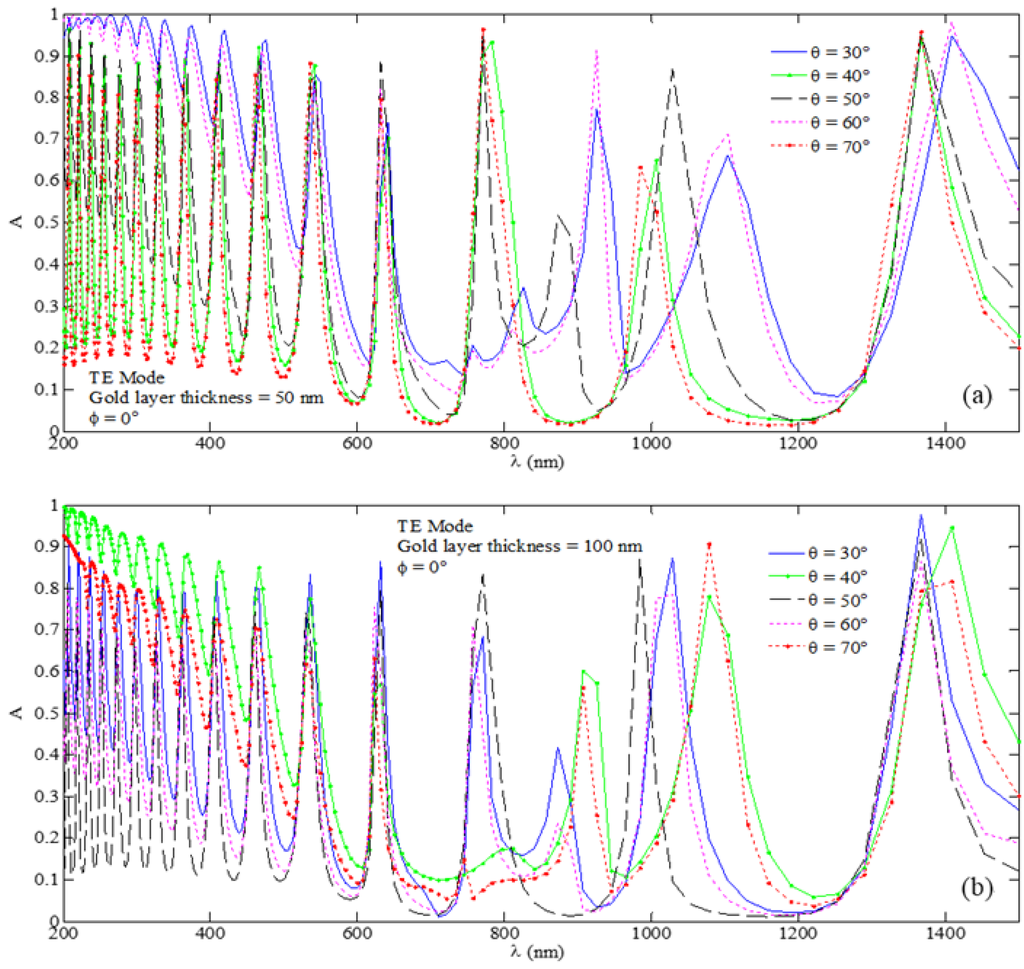 In order to see the effect of the Si layer, the thickness (of this region) is increased to 500 nm, and the absorption spectra are shown in Figure 4. Comparing the results with those obtained with the 100 nm thick Si layer (Figure 3), it can be observed that the number of absorption peaks is now significantly enhanced, and the structure behaves as comb filter [14]. The reason for this is very obvious: the enlarged thickness of wave trapping section will essentially allow proliferation of modes, thereby causing the existence of more absorption peaks. A comparative look at Figure 4a,b leaves impression that the increase of metasurface thickness results in a little more absorption peaks—the feature that has been observed to some extent in Figure 4 too, corresponding to the case of 100 nm Si layer thickness. However, it is the combinational effect of both the metasurface thickness and the wave confinement section thickness that ultimately enhances (or manipulates) absorption peaks of the MPA. This is further justified from Figure 4 which demonstrates over 99% absorption in the short wavelength span with 50 nm metasurface thickness.