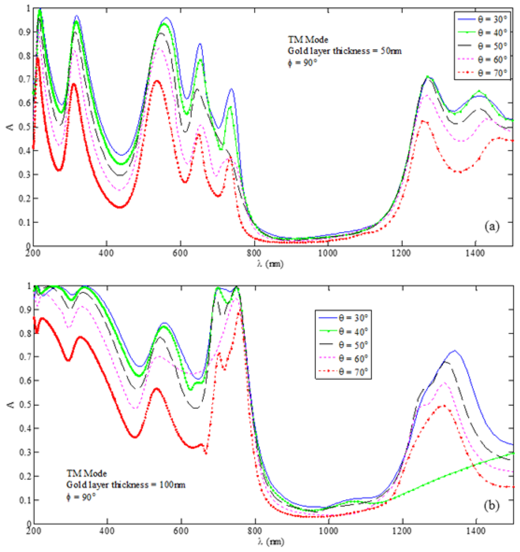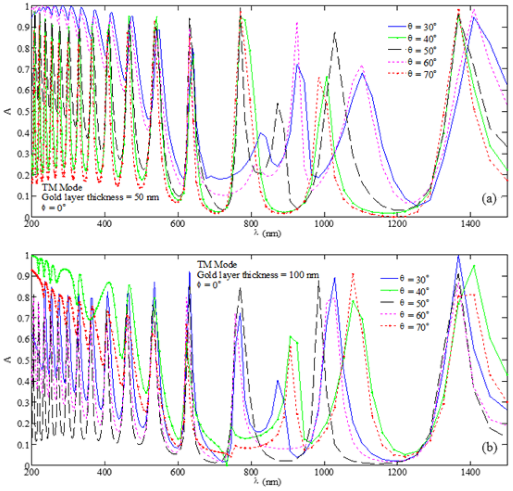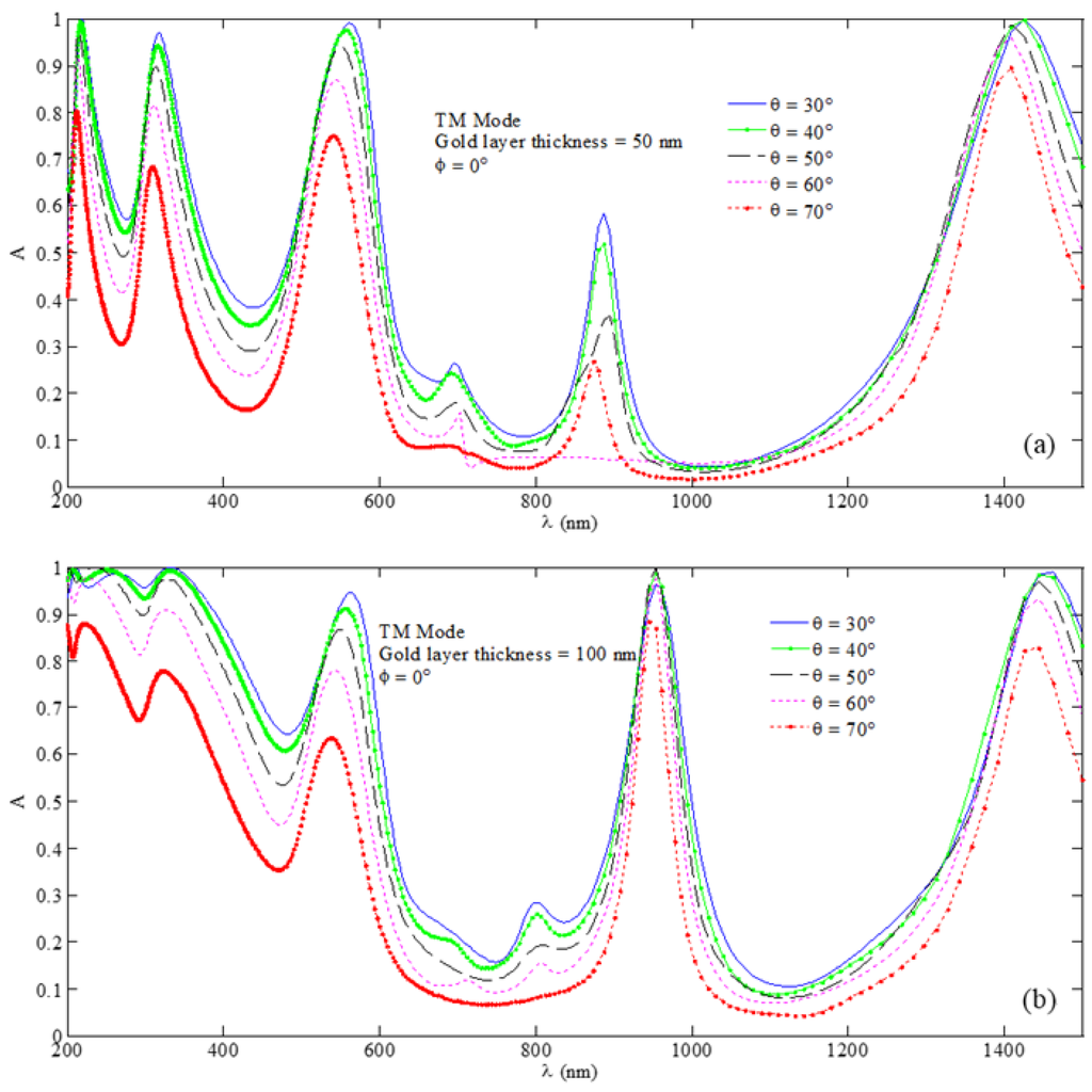 Absorption patterns corresponding to the TM-polarized incident waves (Figure 6) are almost similar to that obtained for the TE excitation (Figure 3). However, enhanced sharpness and amplification of absorption peaks, as observed for both the values of metasurface thickness (i.e., nm (Figure 6a) and nm (Figure 6b)), are the primary advantages of using the TM-polarized incident field over the TE-polarized one (Figure 3). It is clear from Figure 6a that the use of metasurface thickness as 50 nm would yield almost 99.9% absorption at nm under the situation of incidence. Figure 6b shows that the same incidence angle would provide absorption at nm when the metasurface assumes 50 nm thickness. It is clear from Figure 3 and Figure 6 that such a high amount of absorption is rarely achieved with the TE-polarized incidence excitation except in the long wavelength range ( nm), taking into account 100 nm metasurface thickness (Figure 3b) and incidence angle. It can thus be remarked that Figure 6a,b exhibit a angle of incidence as promising to achieve the highest absorptivity in this case, which is similar to the situation of Figure 3 corresponding to the case of TE incidence excitation.
