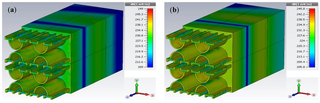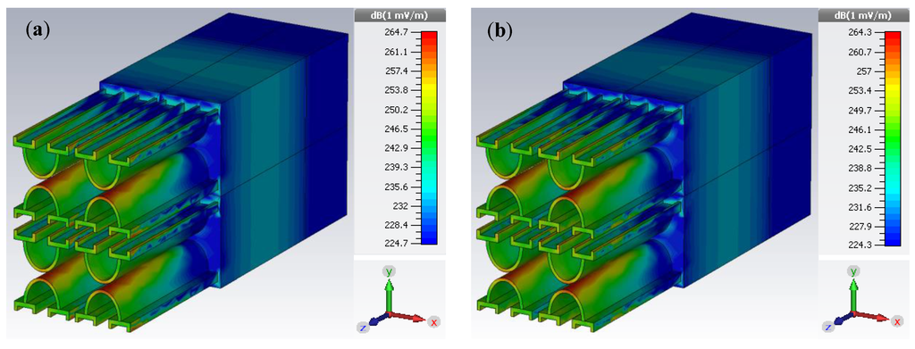 Electric field distributions under the TE-polarized incidence excitation corresponding to (a) nm, and (b) nm, , taking into account nm and nm.