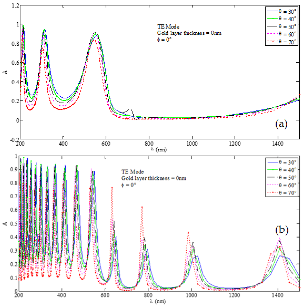 Figure 11a,b, respectively, illustrate the absorption characteristics corresponding to the Si layer thickness as 100 nm and 500 nm, and in the absence of metasurface layer (i.e., ). Comparing the results in Figure 3 and Figure 11a, we observe that, under the TE mode excitation, the presence of metasurface enhances the number of absorption peaks particularly in the longer wavelength range. Clearly, the peaks in regions with nm and nm vanish in the absence of gold metasurface. Also, the variation in has more profound impact on the absorbance in the presence of metasurface, which is essentially due to the plasmonic effect. Further, the increase of the Si layer thickness to 500 nm certainly enhances the number of peaks (Figure 11b), but the comparison of these results with that in Figure 4 clearly indicates the enhancement of absorption in the mid to the longer wavelength ranges of operation. As such, the efficacy of the presence of gold metasurface is justified as the device can then exhibit significantly improved features of absorption.